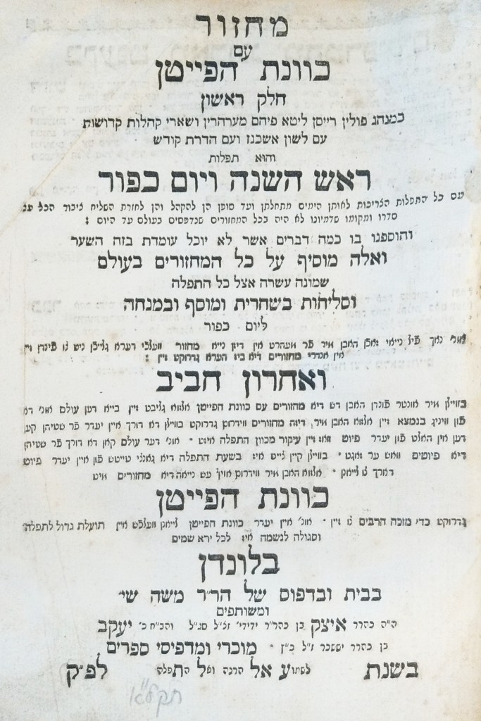 This is the first set of Machzorim – Festival and High Holy Day Prayers – printed by Jewish printers and published in London. It is a two-volume set, published in 1771 by Moses ben Gershon and partners. Prior to this similar volumes, published in Saltzbach and Furth were in use. I have several examples of these, but the London set, which is copied from these older publications, is a finer printing, on generally better paper.