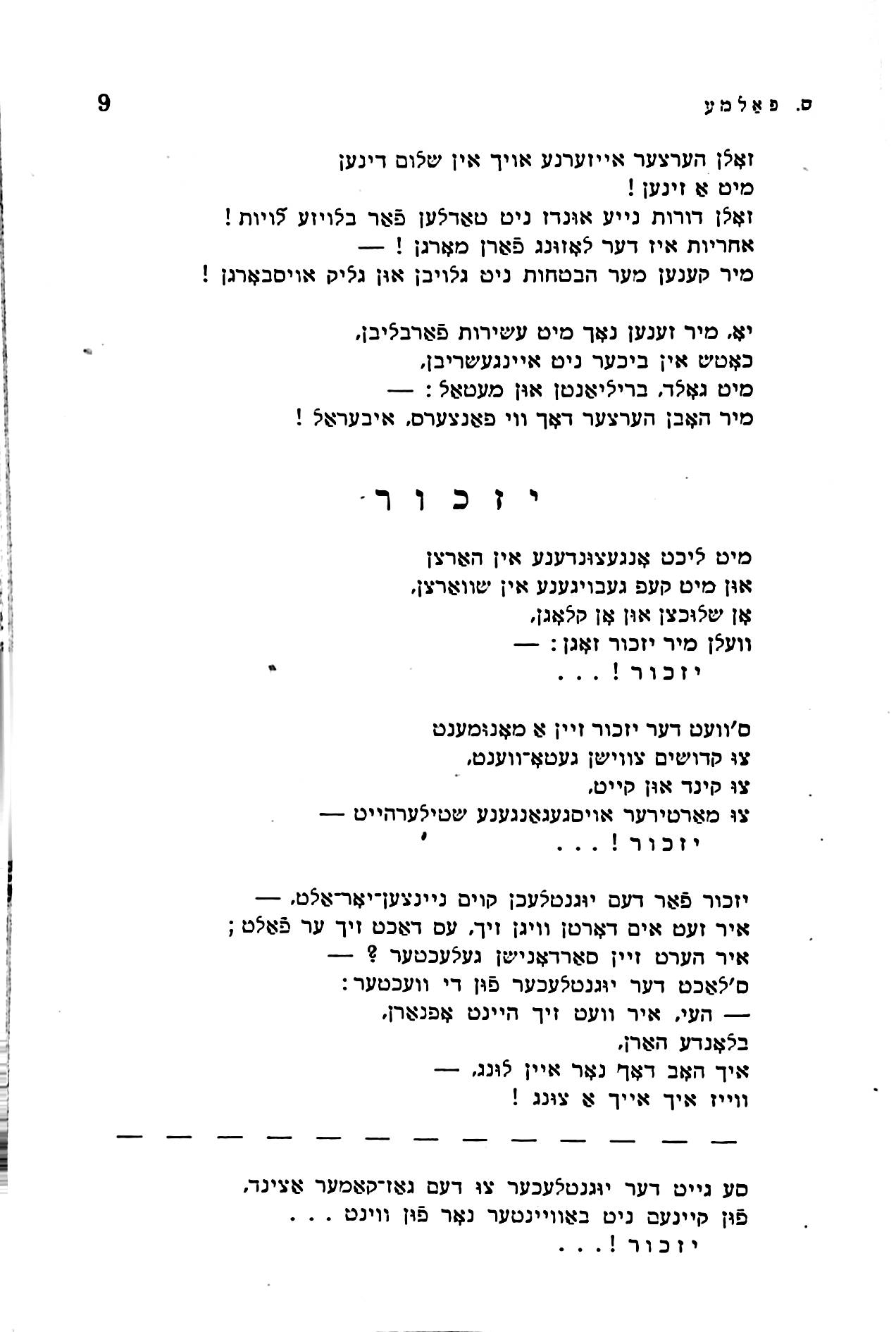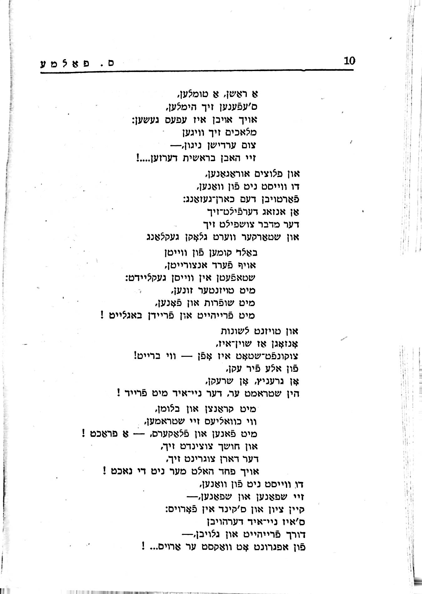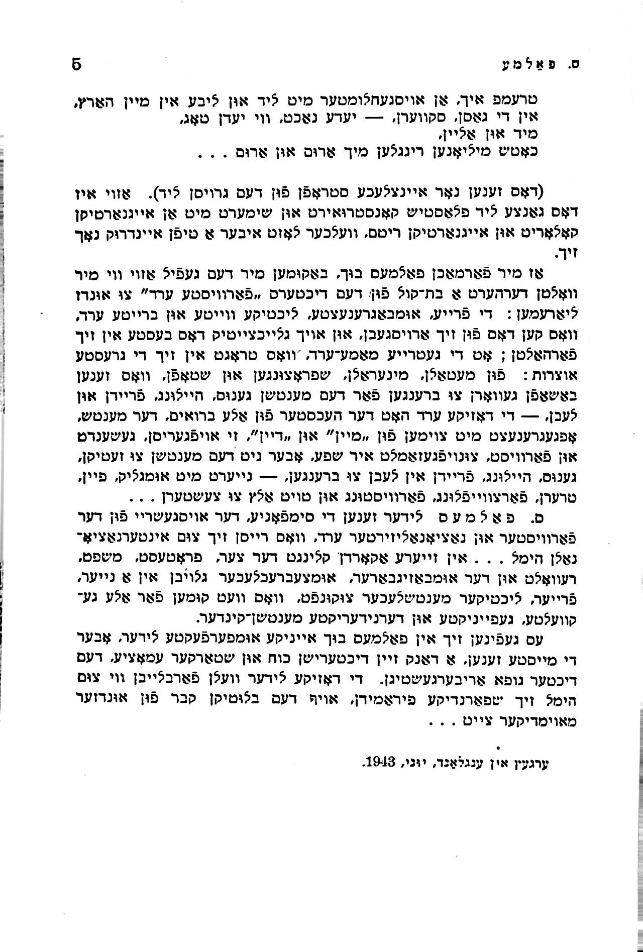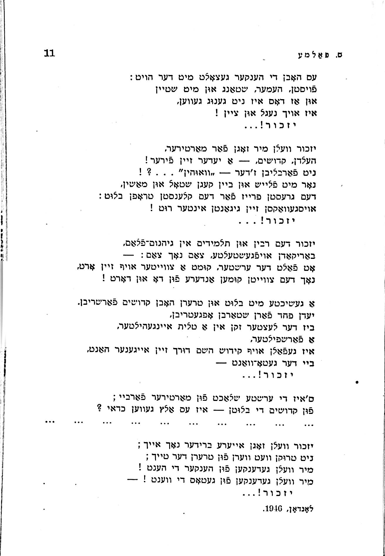 S. Palme first lived in London in 1910. From 1918 to 1922, he lived in Soviet Russia. He debuted in print in 1912 with a poem in the London-based Yidisher Zhurnal (Jewish Journal). He went on to publish poetry in: Yugnt Shtraln (Youth Beams [of Light]), Di Post, Familyen Fraynt (Family Friend), Arbeiter Fraynt (Worker’s Friend), Di Zeit (The Times), and Loshn un Lebn (Language and Life – click here for one of my copies)—all in London. He came from Mezerich in Poland, and one of his poems is included in the Mezerich Yizkor book.