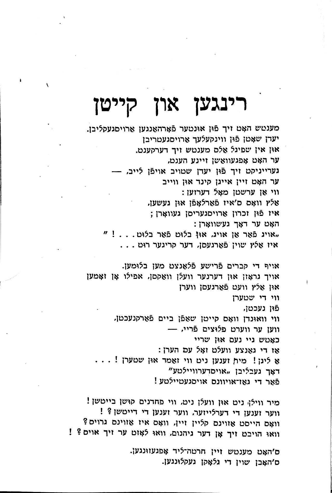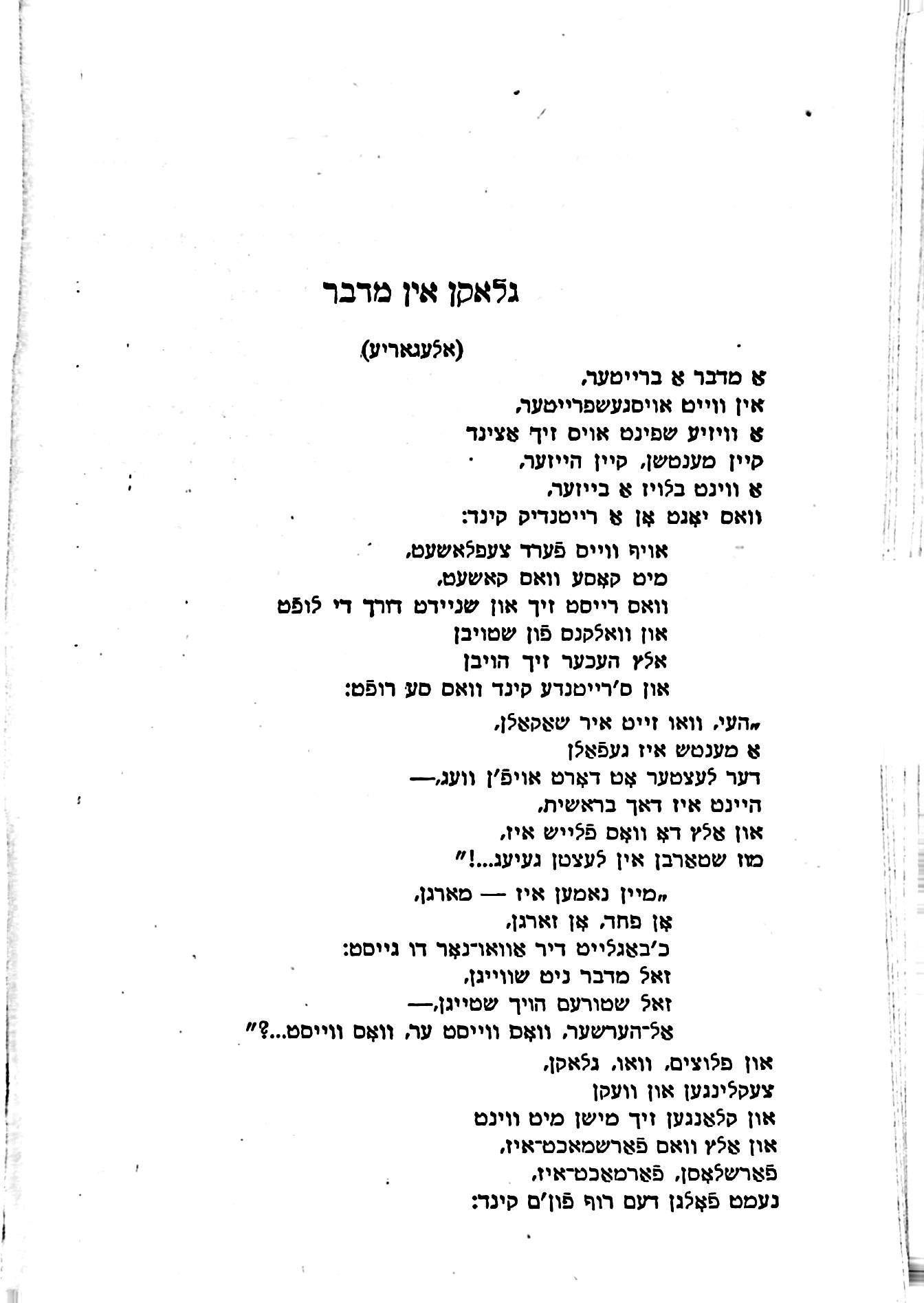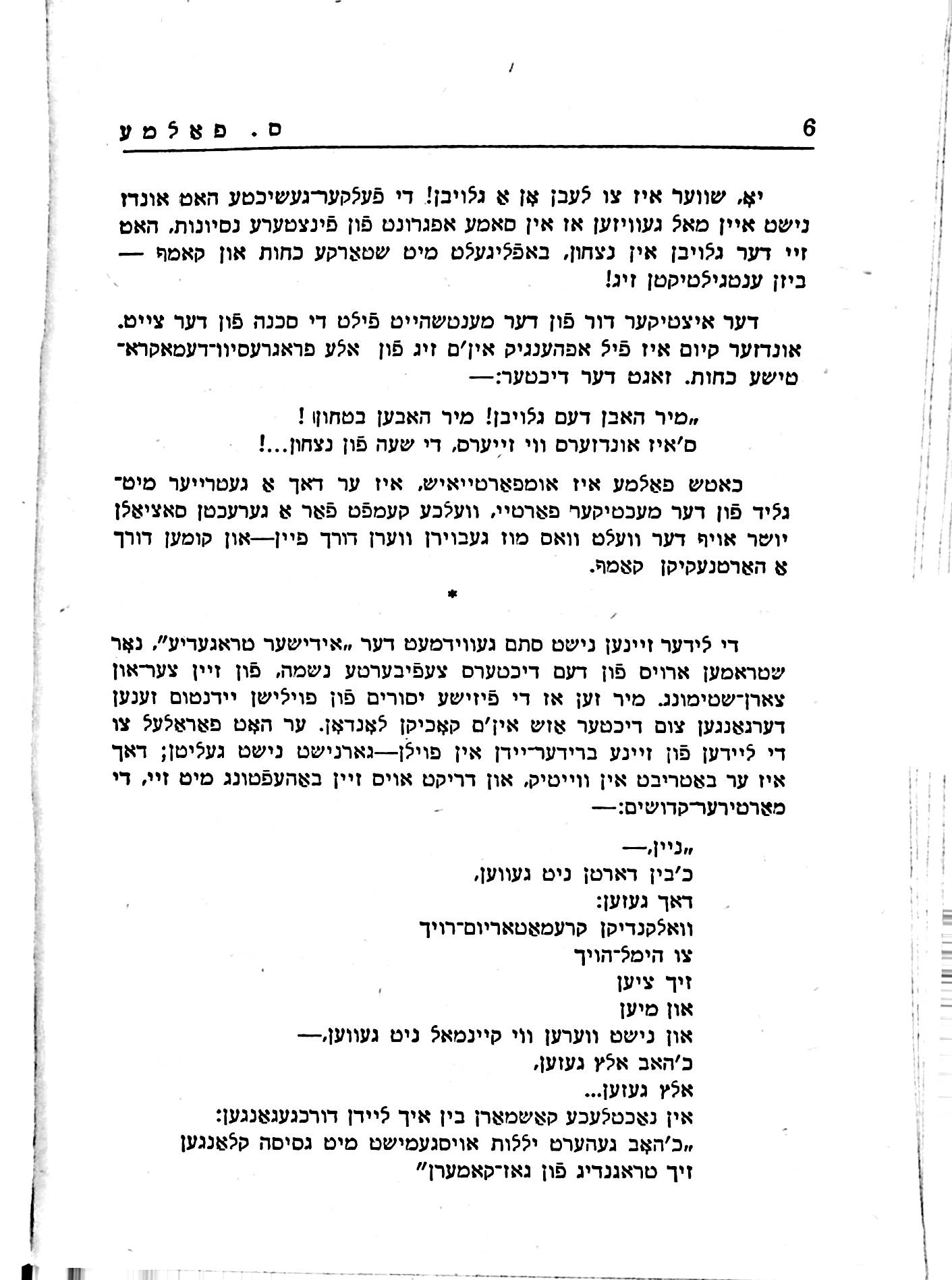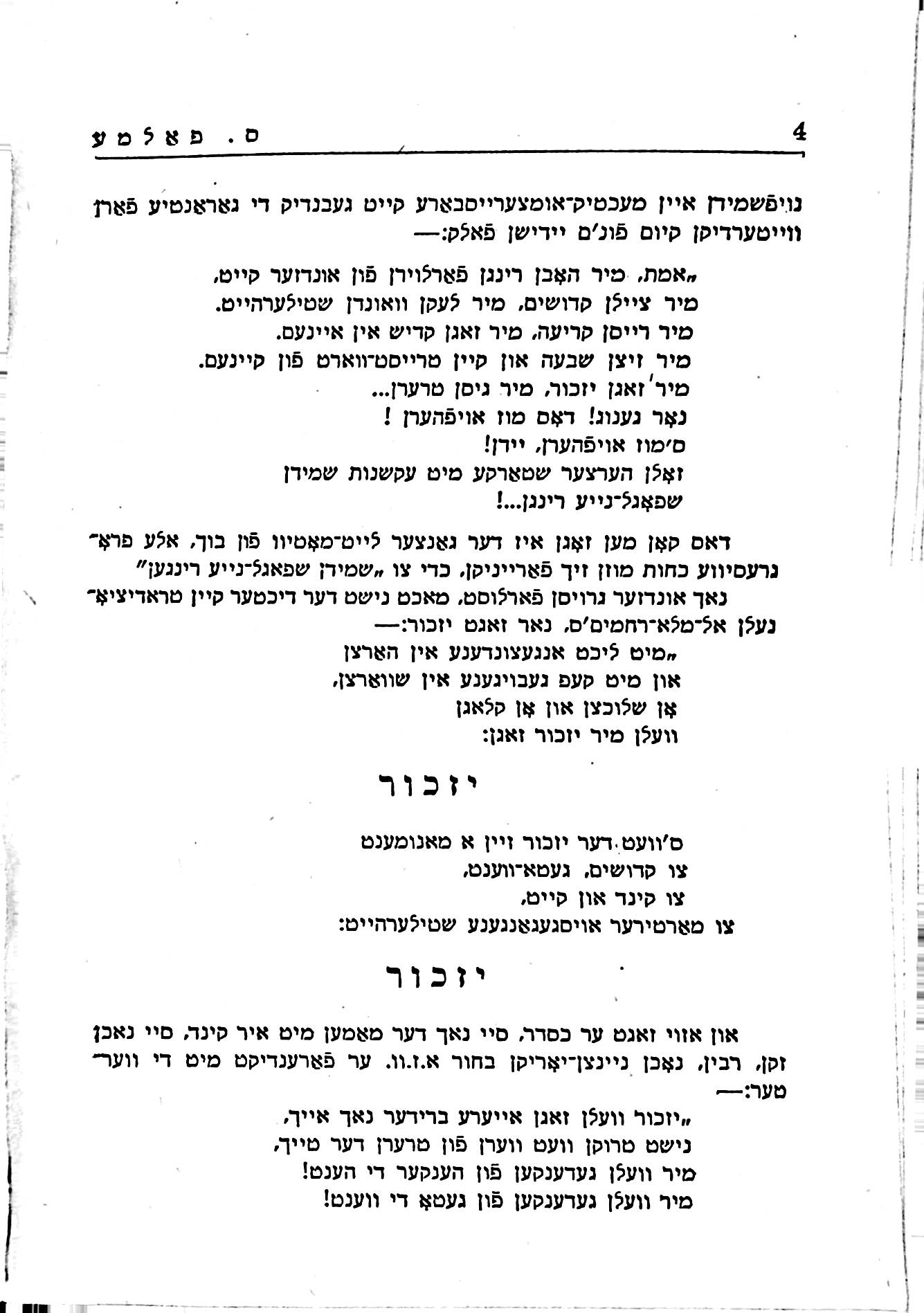 S. Palme first lived in London in 1910. From 1918 to 1922, he lived in Soviet Russia. He debuted in print in 1912 with a poem in the London-based Yidisher Zhurnal (Jewish Journal). He went on to publish poetry in: Yugnt Shtraln (Youth Beams [of Light]), Di Post, Familyen Fraynt (Family Friend), Arbeiter Fraynt (Worker’s Friend), Di Zeit (The Times), and Loshn un Lebn (Language and Life – click here for one of my copies)—all in London. He came from Mezerich in Poland, and one of his poems is included in the Mezerich Yizkor book.