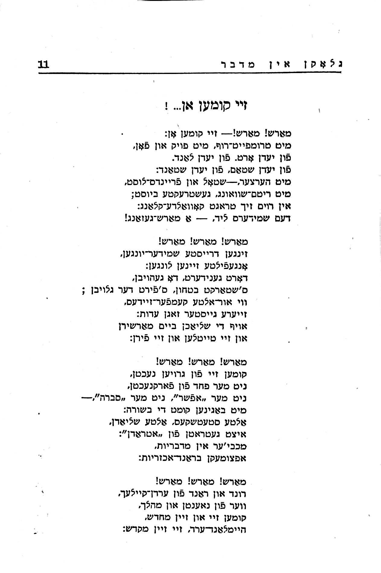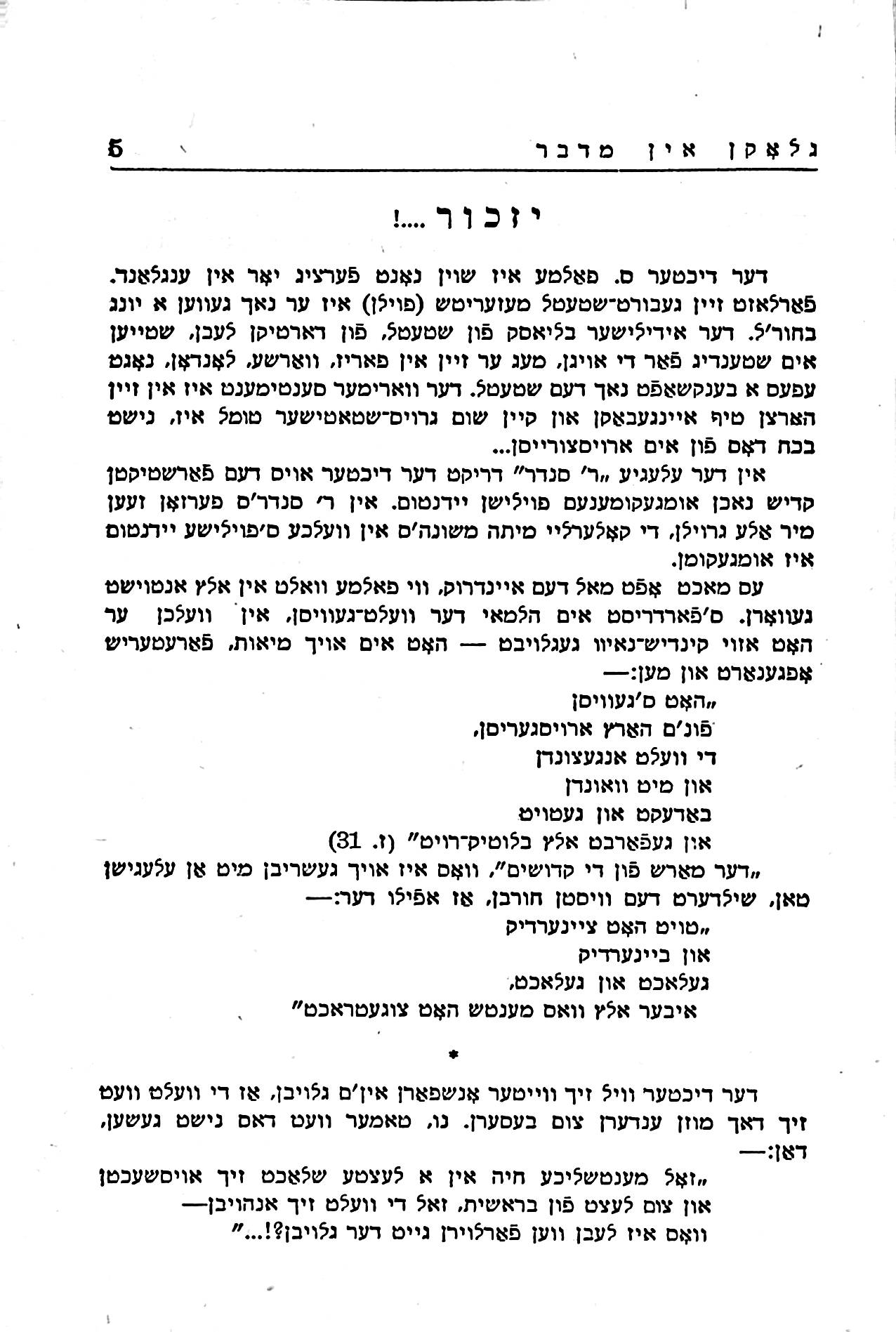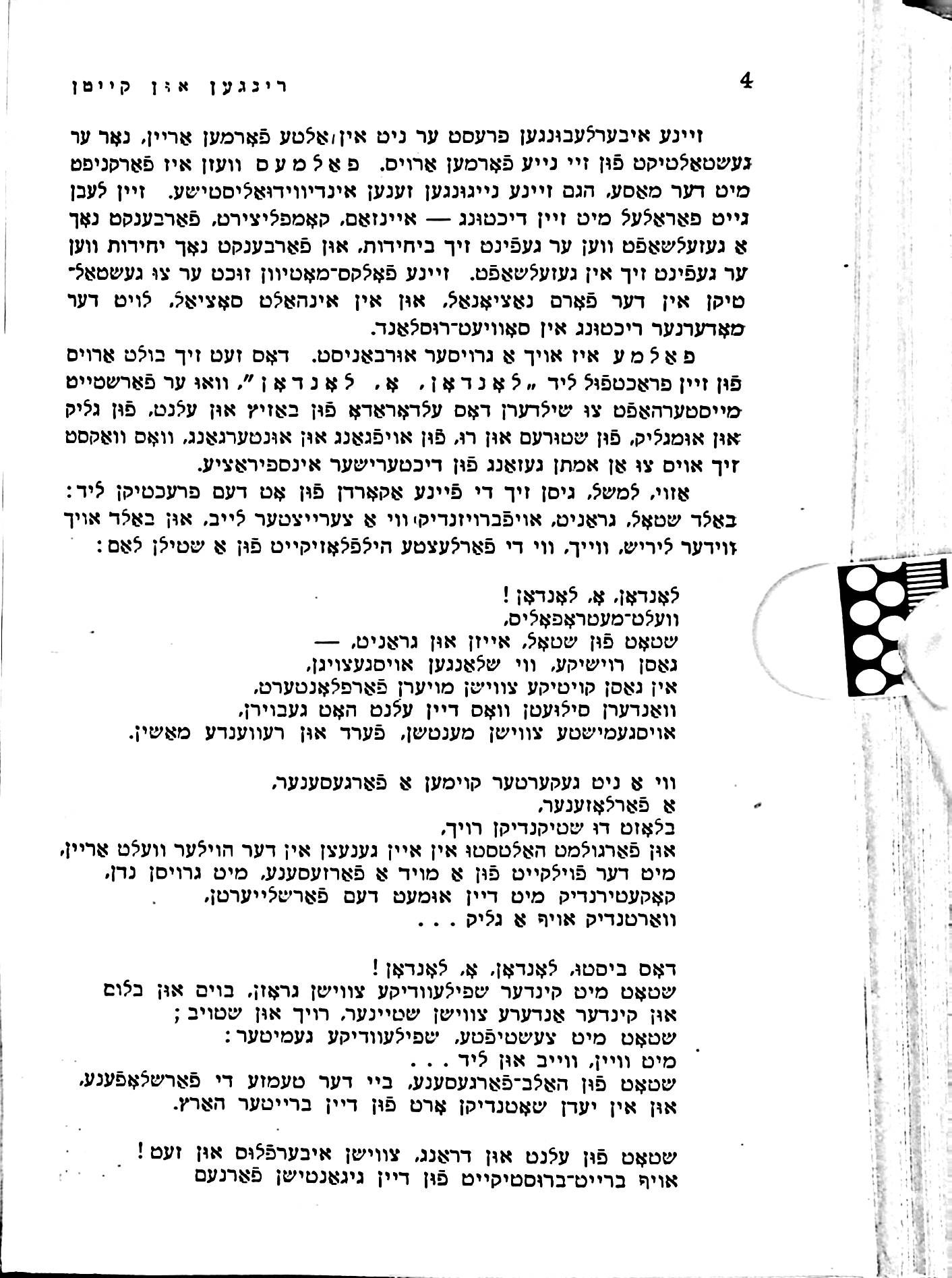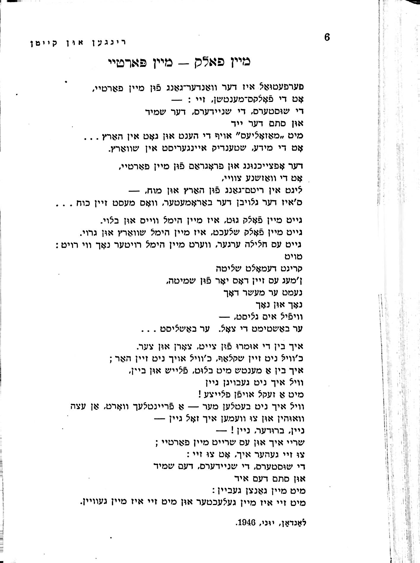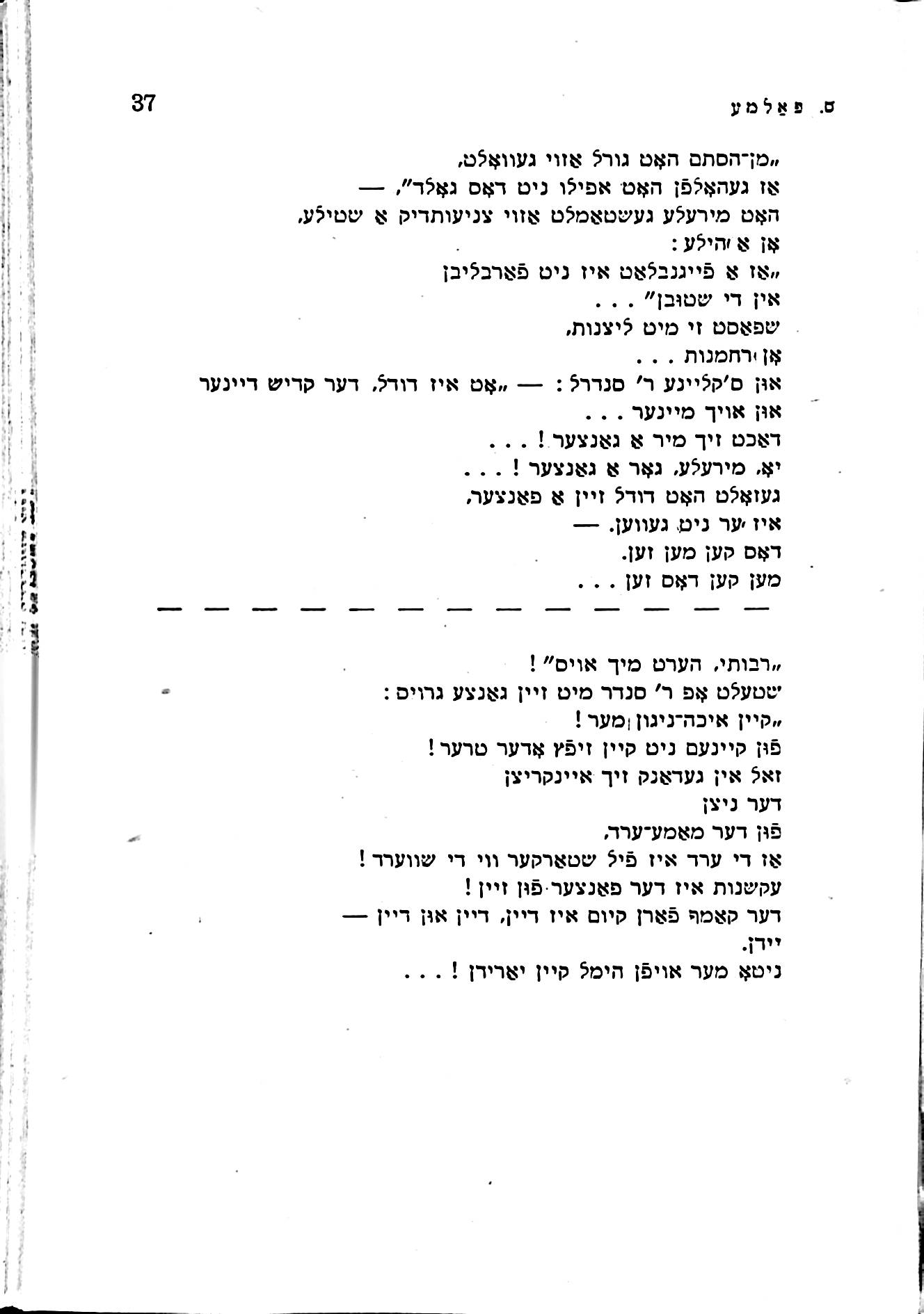 S. Palme first lived in London in 1910. From 1918 to 1922, he lived in Soviet Russia. He debuted in print in 1912 with a poem in the London-based Yidisher Zhurnal (Jewish Journal). He went on to publish poetry in: Yugnt Shtraln (Youth Beams [of Light]), Di Post, Familyen Fraynt (Family Friend), Arbeiter Fraynt (Worker’s Friend), Di Zeit (The Times), and Loshn un Lebn (Language and Life – click here for one of my copies)—all in London. He came from Mezerich in Poland, and one of his poems is included in the Mezerich Yizkor book.
