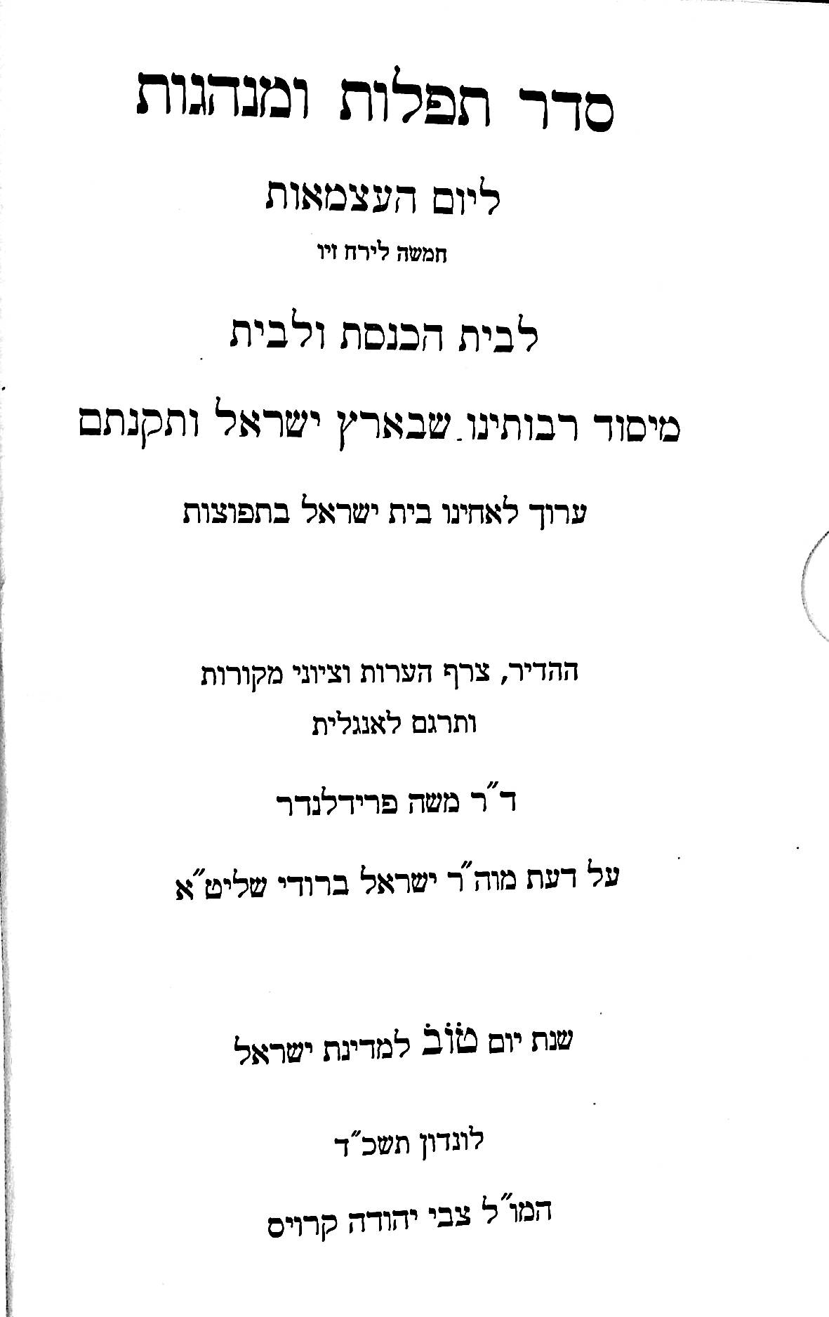 This book copies the traditional style of the blue 20th Century Adler Machzorim (Holiday Prayer Books), and has a similar binding. It is interesting because it combines prayers and celebration of Yom HaAtzmaut with some British flavours.