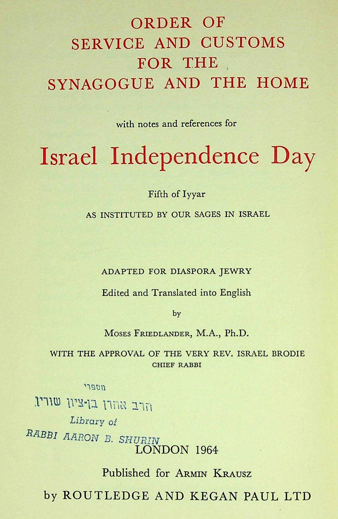 One thought on “Order of Service for Israel Independence Day, edited by Moses Friedlander, published for Armin Krausz by Routledge and Kegan Paul, Ltd., London 1964”