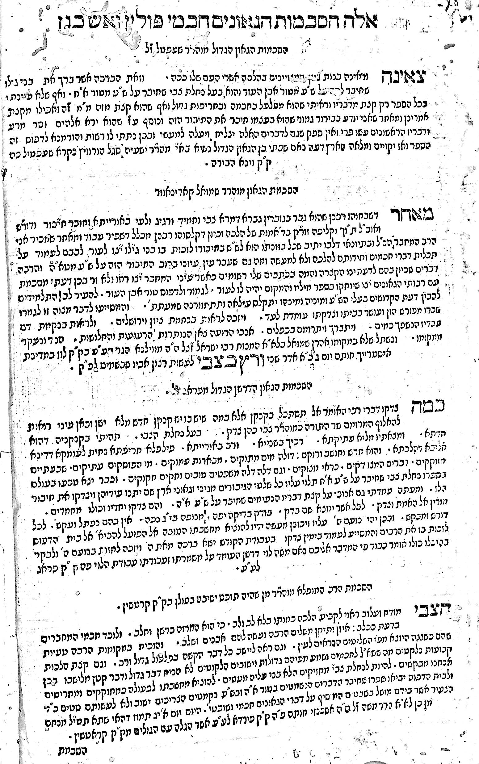 There is a fantastic selection of haskomos (approbations). The first is from Rabbi Shabasai Sheftel Horowitz, who was a son of Rabbi Isaiah Horowitz, known as the ‘Holy Shelah’. He had died in 1660, just before the book was printed.