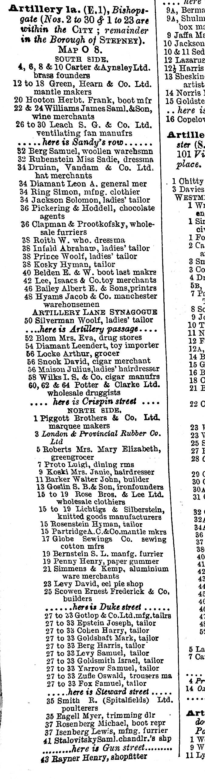 This huge book is not Anglo-Judaica but it is packed with thousands of pages of information.  As a sample, I’ve chosen some streets in the East End of London, including several with synagogues, which establishes their addresses.  There are hundreds of small shops and businesses.  These scans also demonstrate the large numbers of Jewish families, often living over the shop, who were in the East End before the bombing of the Second World War dispersed the community.