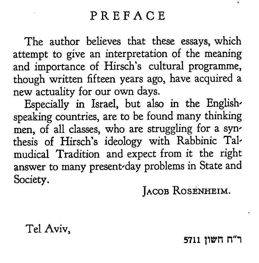 The author, who writes about Rabbi Hirsch, is Jakob Rosenheim. He was born in Frankfurt in 1870, where his father, Elias Rosenheim, was a bookseller and an early adherent to Samson Raphael Hirsch’s neo-Orthodox Judaism movement.
