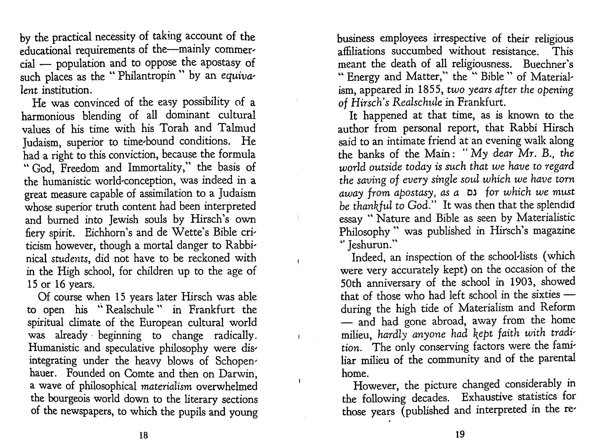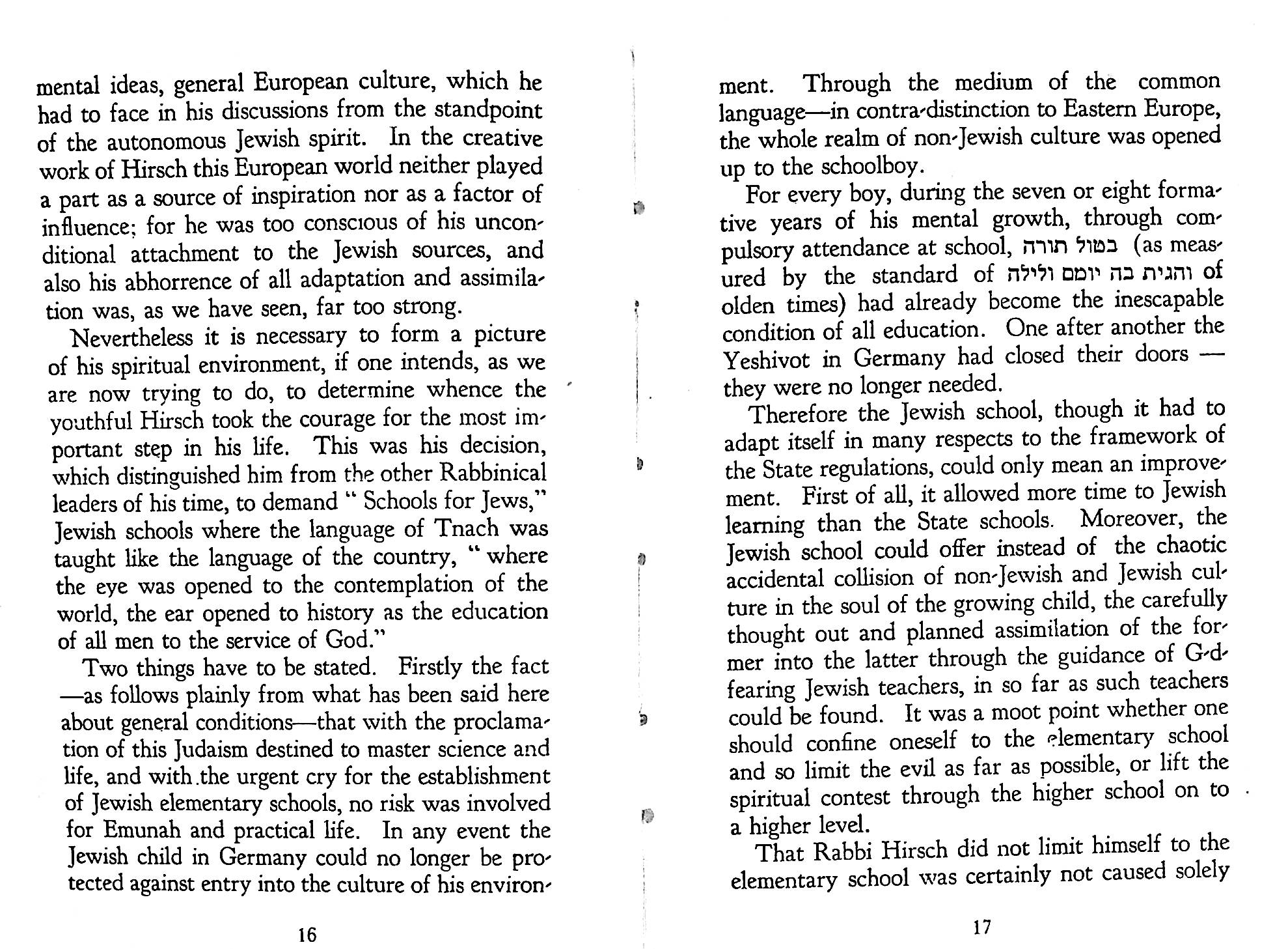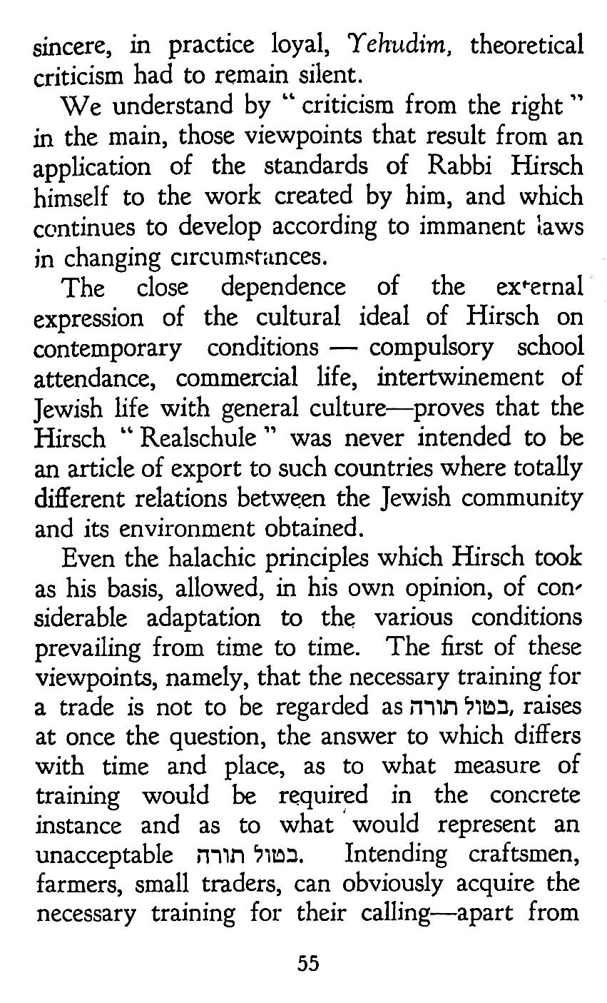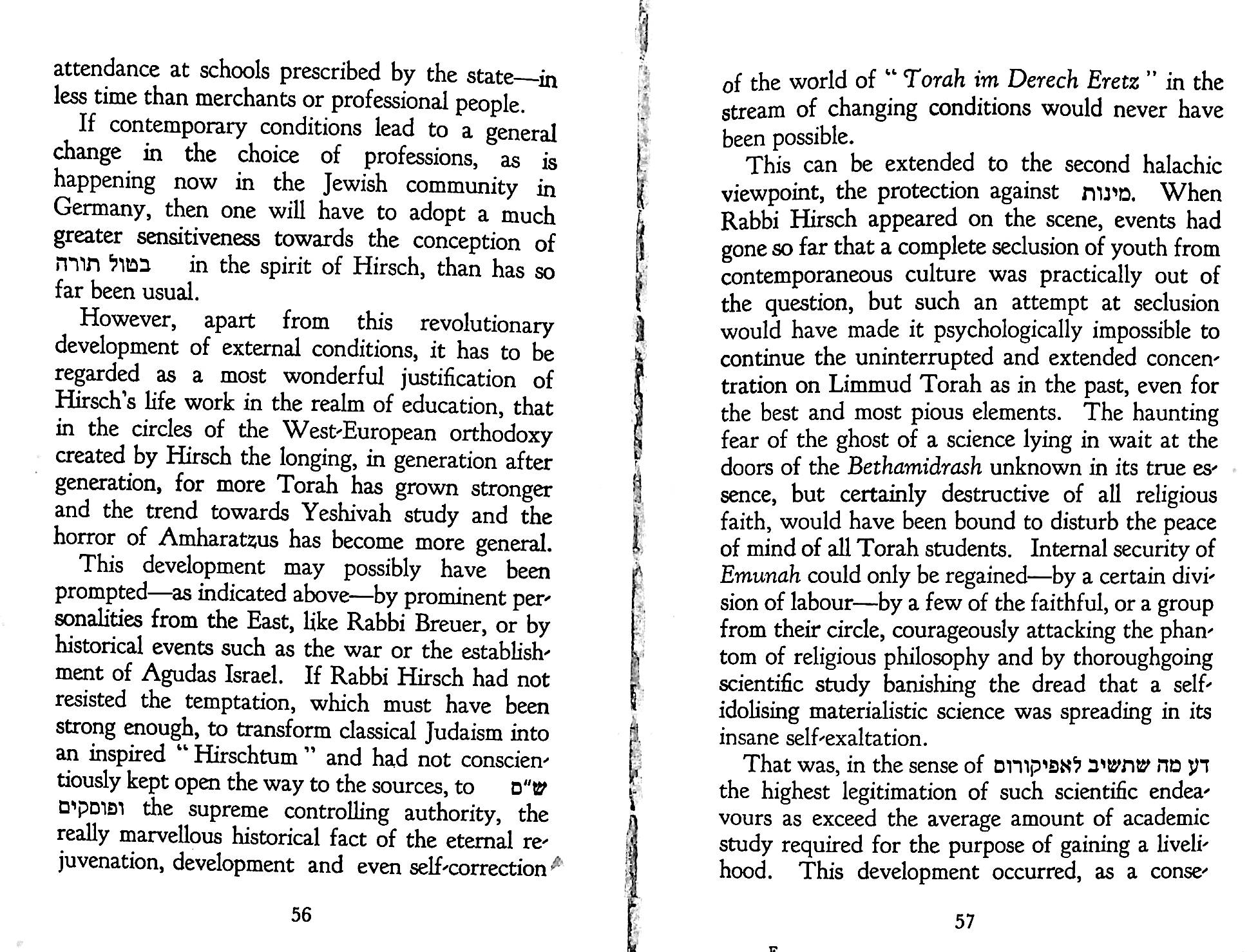 The statement in Pirkei Avos (Ethics of the Fathers), Chapter 2, 2 of Rabbi Gamaliel III: “Torah is good together with Derech Eretz (the way of the earth)” formed the basis of Hirsch’s understanding of Judaism for modern Jews. In the context this refers to a worldly occupation. But Hirsch developed the concept to embrace Western culture.