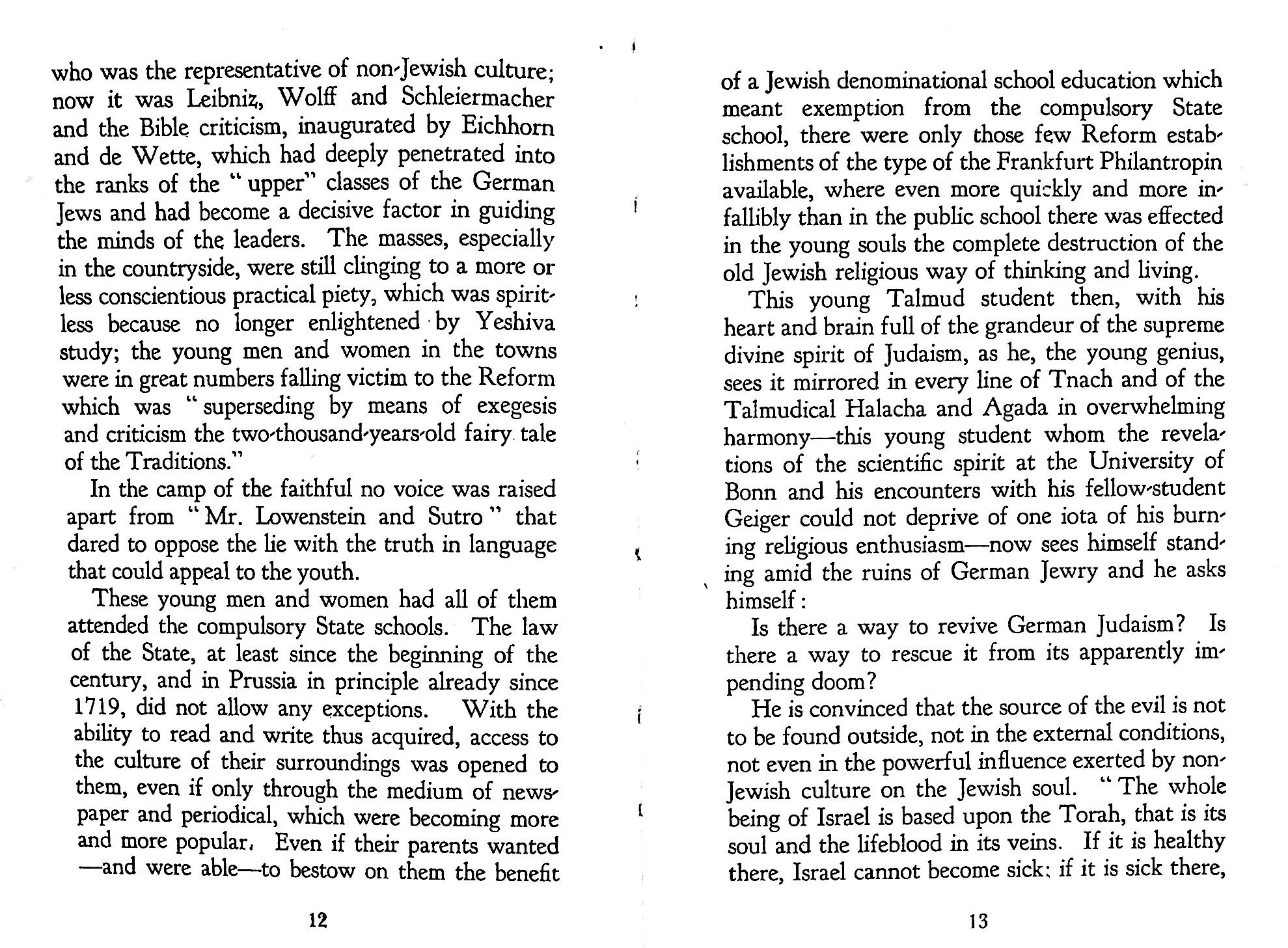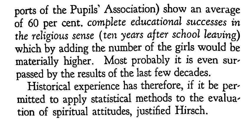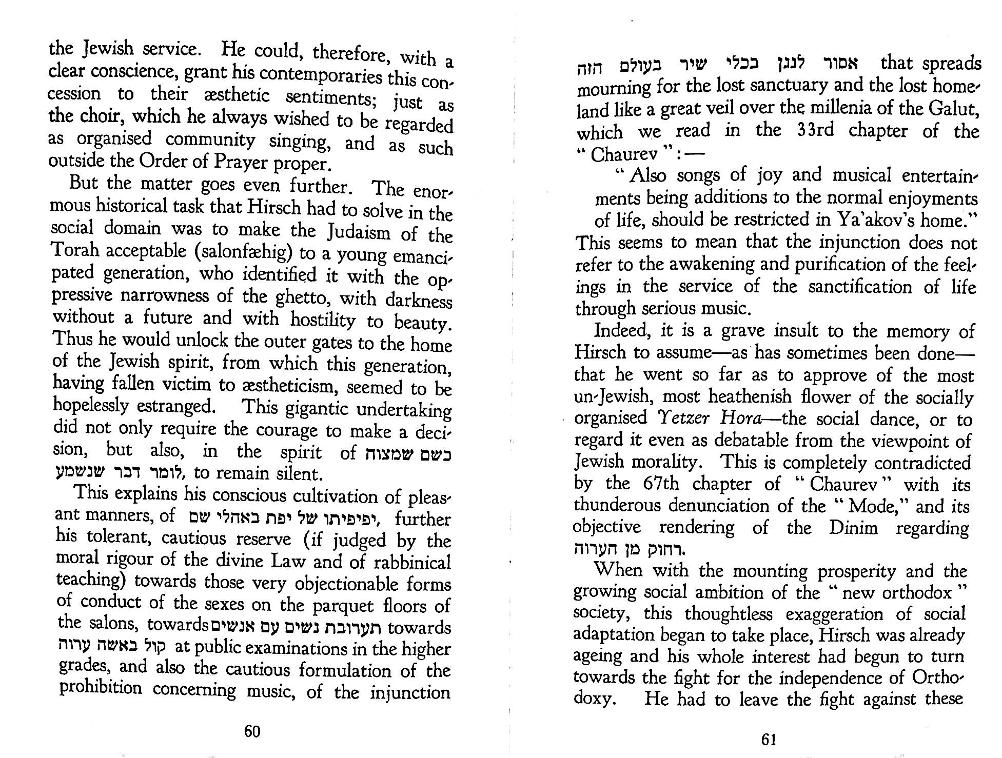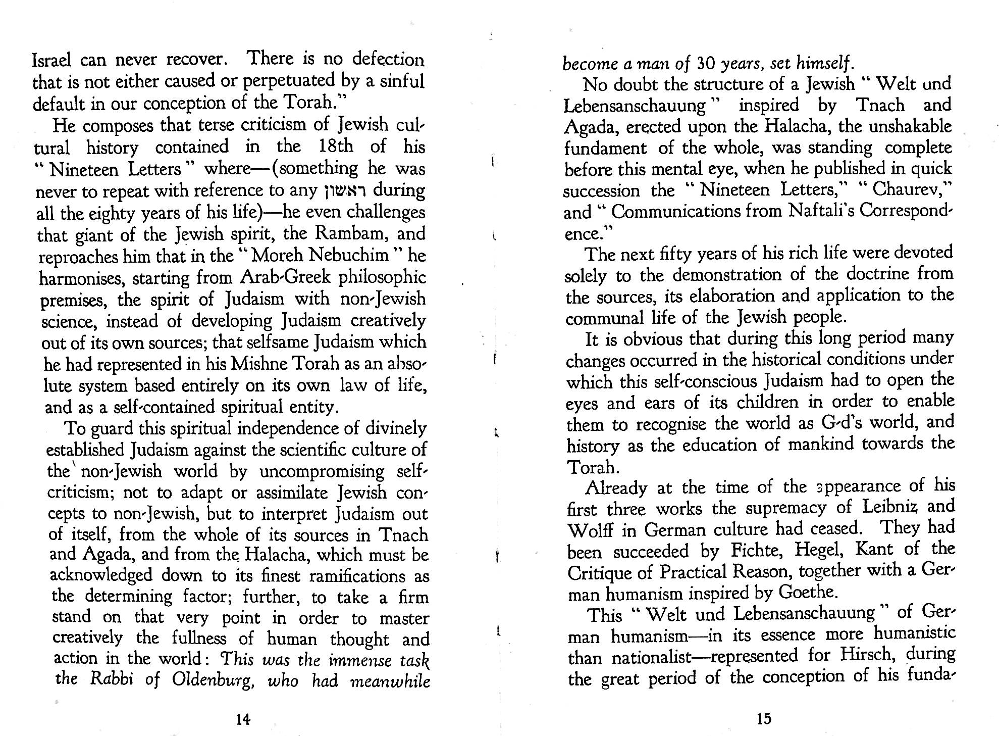 The statement in Pirkei Avos (Ethics of the Fathers), Chapter 2, 2 of Rabbi Gamaliel III: “Torah is good together with Derech Eretz (the way of the earth)” formed the basis of Hirsch’s understanding of Judaism for modern Jews. In the context this refers to a worldly occupation. But Hirsch developed the concept to embrace Western culture.