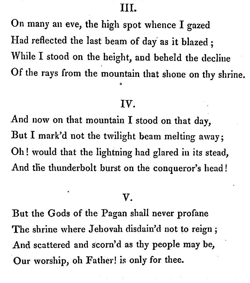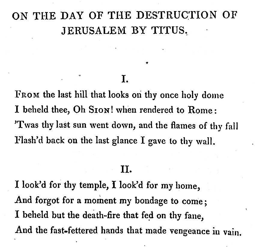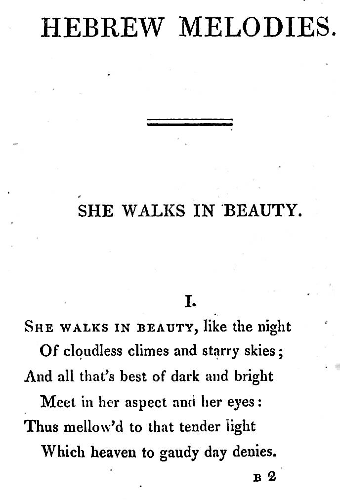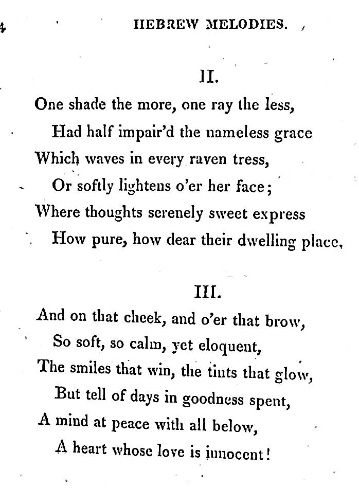 Isaac Nathan was an aspiring composer who was born in 1790 to parents who had immigrated from Poland.  His father was the Chazan (cantor) of Canterbury synagogue, and Isaac was originally educated to be a rabbi. He had published an advertisement in the London Gentleman’s Magazine in May 1813 that he was “about to publish ‘Hebrew Melodies’, all of them upward of 1000 years old and some of them performed by the Ancient Hebrews before the destruction of the Temple”.  At this stage, he had no words to go with the melodies which he intended to adapt from synagogue usage (although many of the tunes did not have the ancient ancestry that he claimed). Byron was encouraged by his friend Douglas Kinnaird to take up Nathan’s proposal. Many of the poems were written during the period of Byron’s sessions with Nathan between October 1814 and February 1815; a few, including the first one “She Walks in Beauty” predate their meeting, although Nathan set this poem to a melody that was used in the Synagogue for Adon Olam, a song that is sung in the Synagogue at the end of the Saturday morning service.