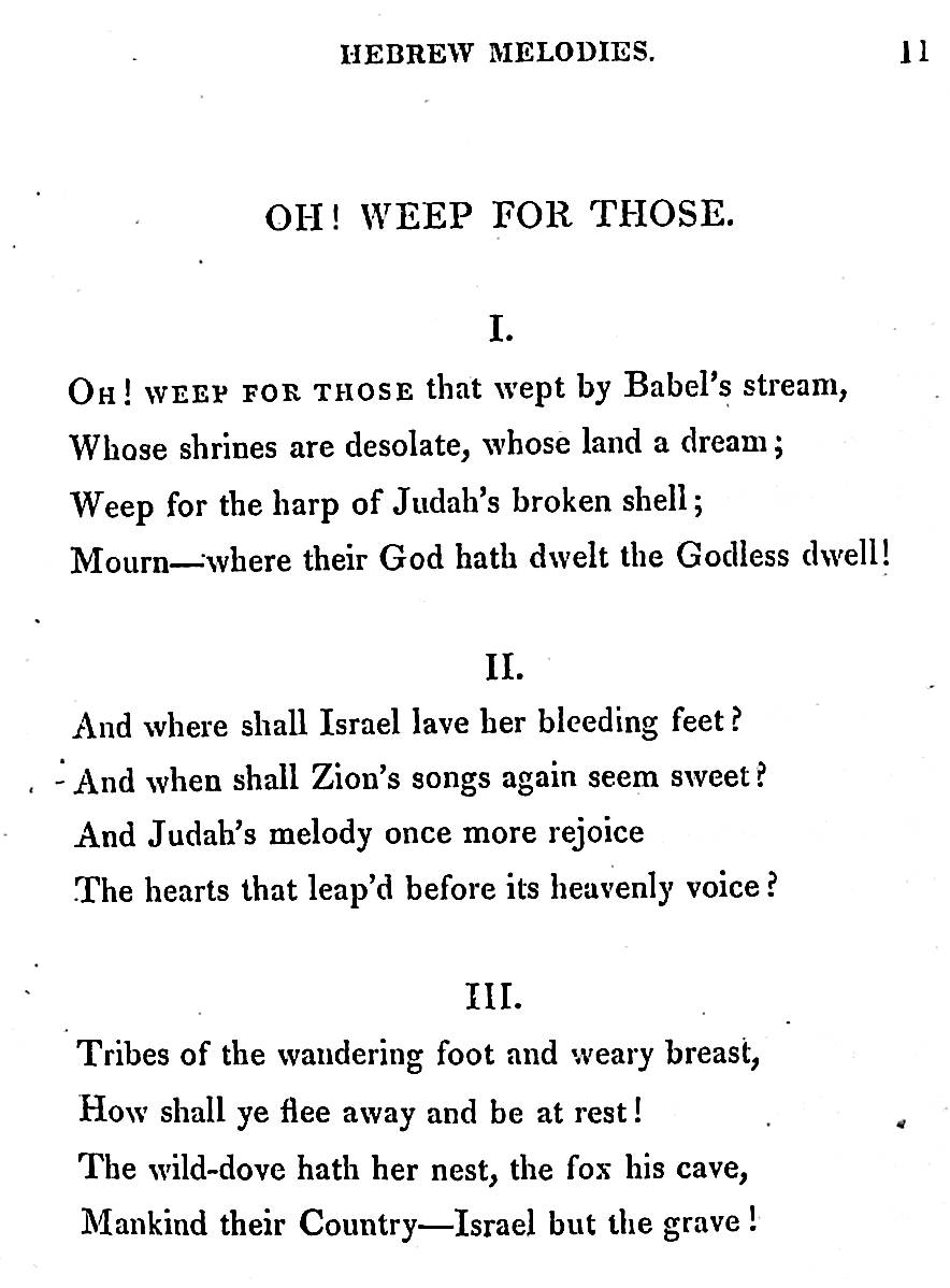 Byron seems to have been sympathetic at the time to the cause of the Jews, and left the copyright of Hebrew Melodies to Nathan.