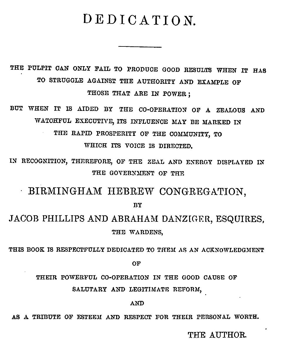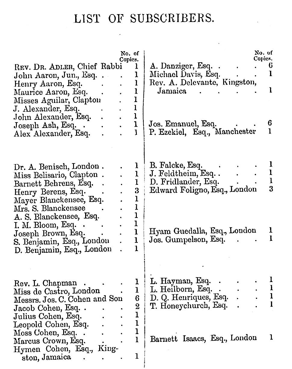 The book had significant support and includes a subscription list headed by the Chief Rabbi, Dr. Nathan Adler, and 14 copies were bought by Sir Moses Montefiore. Multiple copies were bought by the wardens of the Birmingham Hebrew Congregation, in its prior building to the current Singers Hill synagogue, Abraham Danziger and Jacob Phillips.