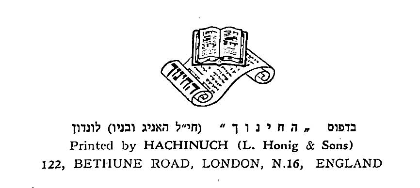 This book was printed by Hachinuch (L. Honig and sons). At the end is an interesting list of donors who financed the printing.