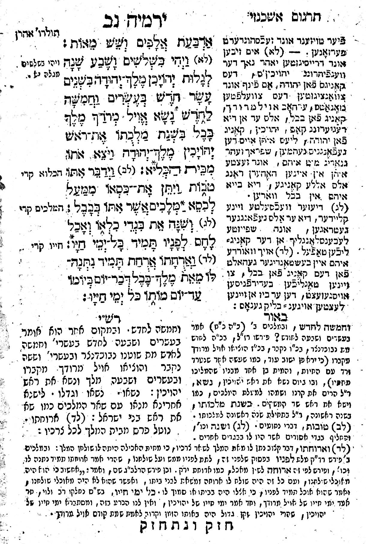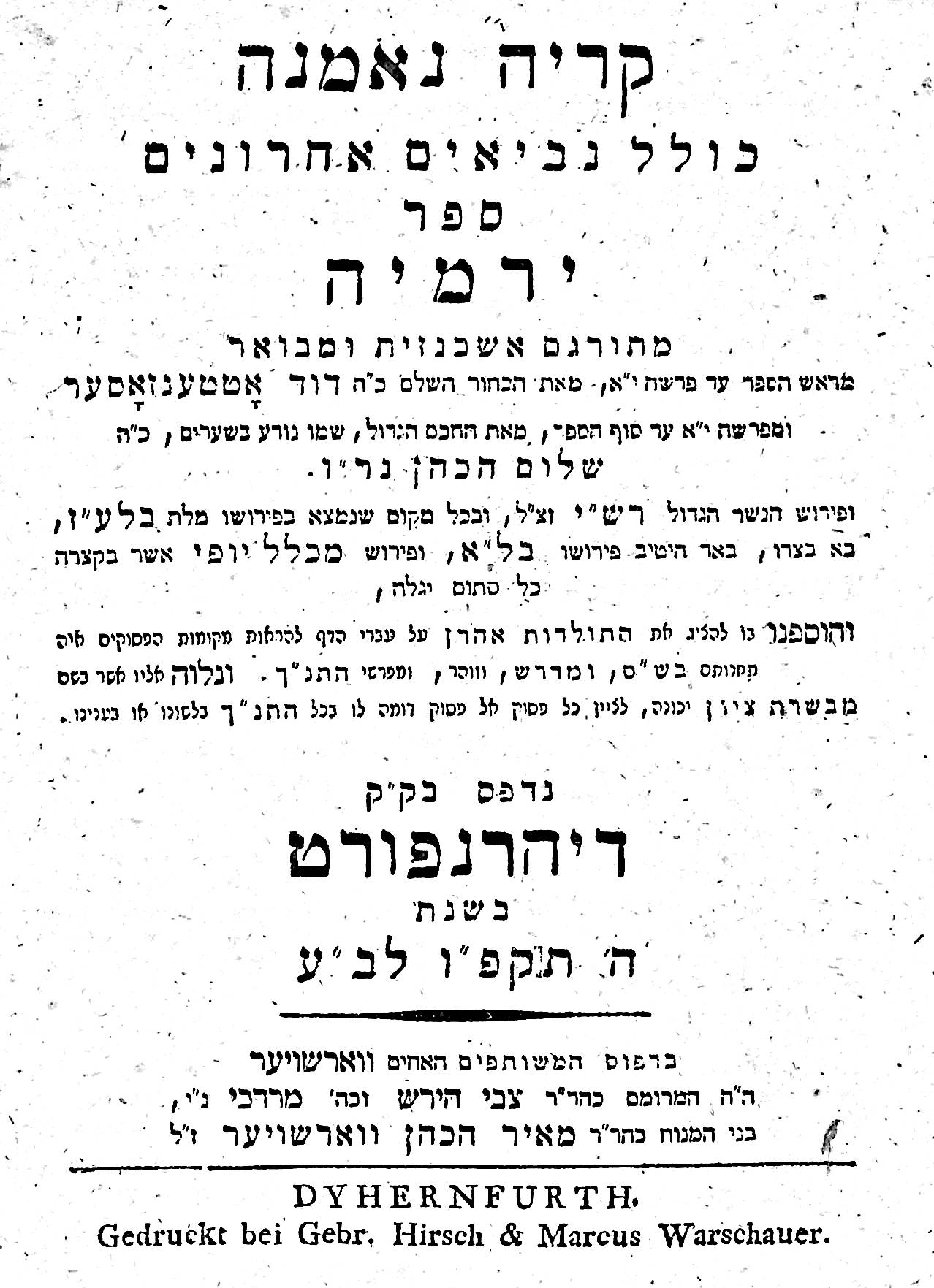 This edition, as well as Rashi, includes a translation into German (in Hebrew letters) and a commentary by David Ottensoser. He was a learned translator and commentator, described by the London Jewish Chronicle in 1849 as “one of the greatest exegetics of our age” and “the veteran commentator of the German school”. However, after translating the first 11 chapters of Jeremiah, he was unable to continue as he had become blind.