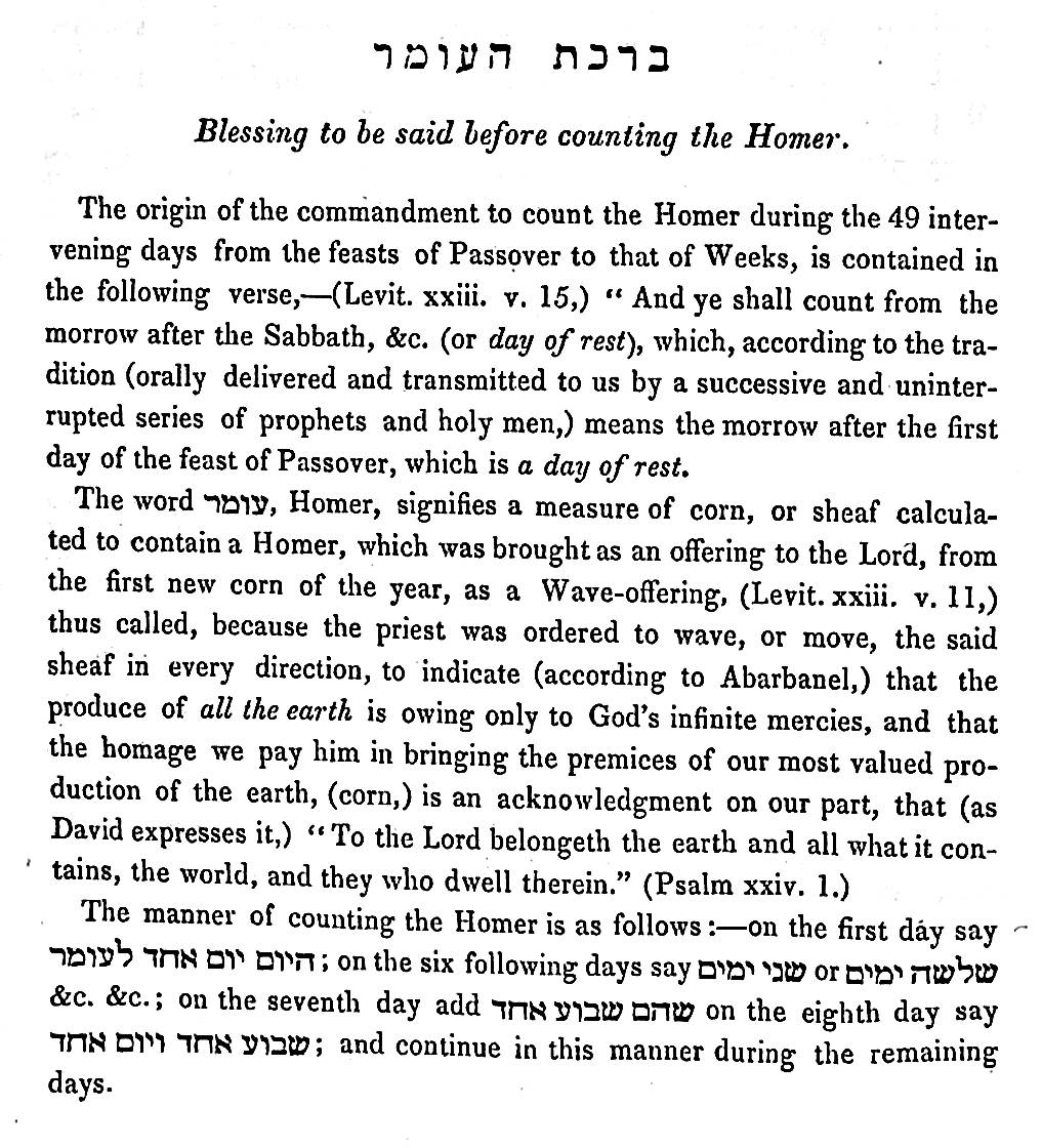 As has been noted in other translations and transliterations of this period, the English London Jews pronounciation of Hebrew may have been influenced by the East End London accent. The H sound is sometimes missing or dropped, and so we have ‘Aphtorah, not ‘Haphtorah”. Also, in the book we have the ‘counting of the Homer’.