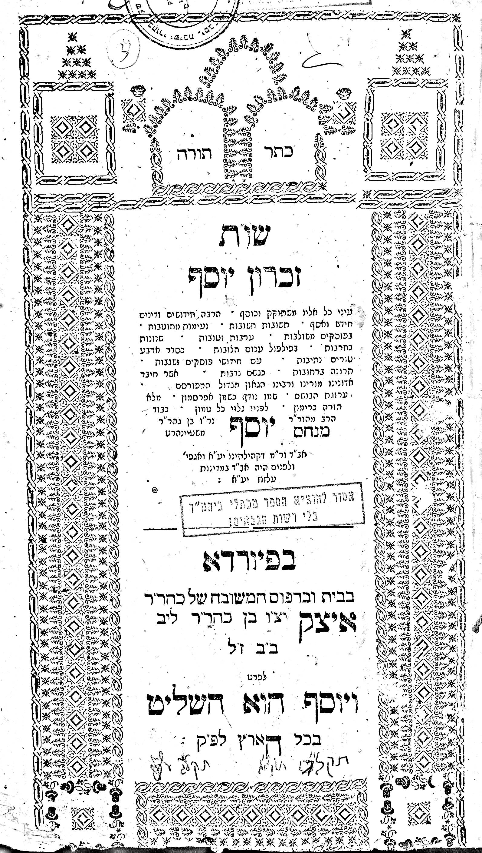 Rabbi Yosef ben Menachem Steinhardt (1720 – 1776) was an important German Rabbi. He studied at the yeshiva of Rabbi Yaakov Hakohen Poppers, in Frankfurt. In 1746 he lived in Schwabach, Bavaria. He later served as rabbi of Alsace, with his seat at Rixheim. In 1755 he was appointed chief rabbi of Niederenheim in Lower Alsace, and from 1763 until his death served as rabbi of Fuerth.