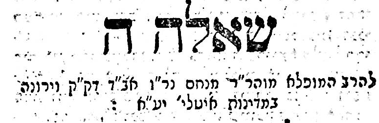 His fame as a halakhic (Jewish legal) authority was such that problems were addressed to him from Hungary, Italy, Amsterdam and Switzerland. He maintained a regular correspondence with his brother-in-law, Yeshaye ben Yehuda Leib Berlin, with whom he communicated on various problems. In his work Rabbi Steinhardt quotes comments and novellae by his learned wife, Kreindel, Isaiah Berlin’s sister; Kreindel also urged her husband to publish his work.