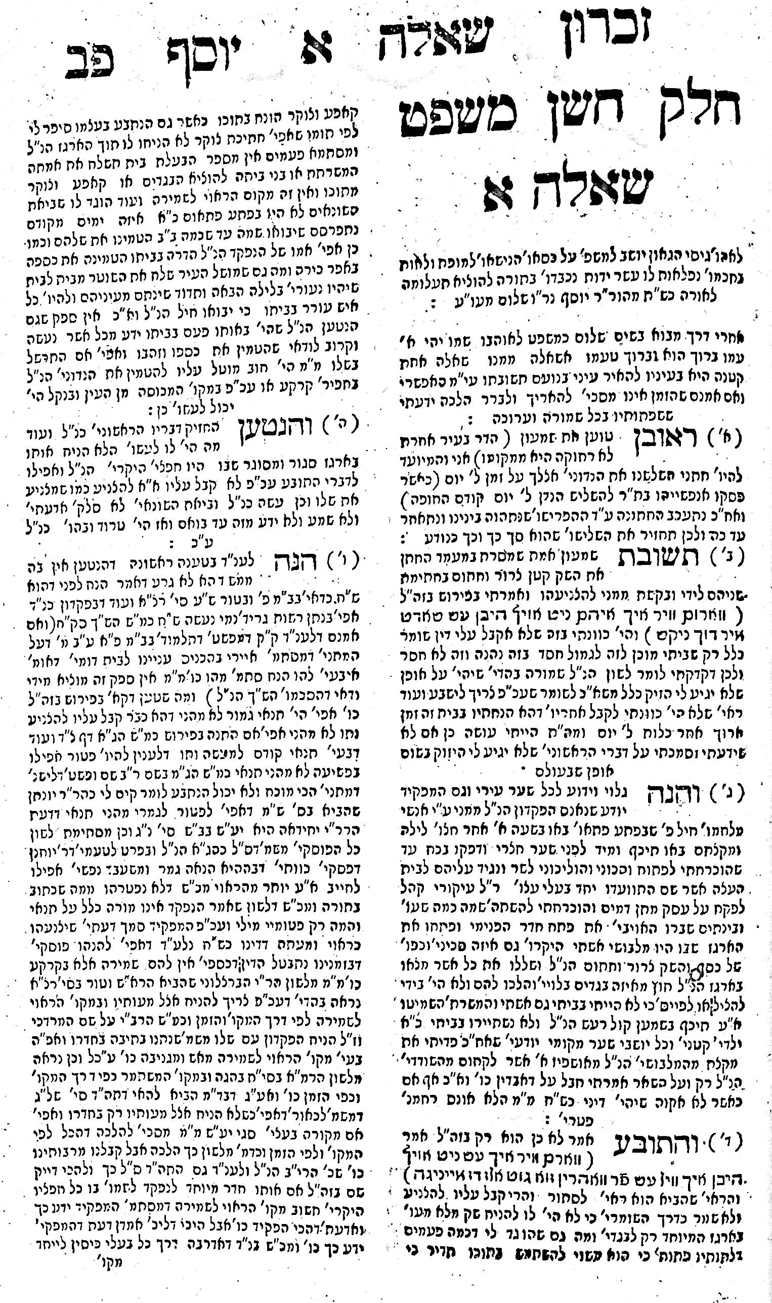 This book, Zichron Yosef, consists of responsa and rulings on the four divisions of the Shulchan Aruch, with an appendix of his novellae and sermons. Rabbi Steinhart declined to give a ruling on his own authority in difficult problems, emphasizing that he was one of “those apprehensive of giving rulings,” and suggested that the concurrence of authoritative rabbis be sought. He took a firm stand on fundamental issues that were likely to undermine morality and religion. He was especially opposed to mixed dancing, and stressed that “any rabbi and instructor is obligated to protest and to abolish any type of mixed dancing that is planned for his city during a festival.” In the course of his responsa, he describes how he canceled a dance arranged in Niederenheim, even after the Jewish community had obtained permission from the secular authorities.