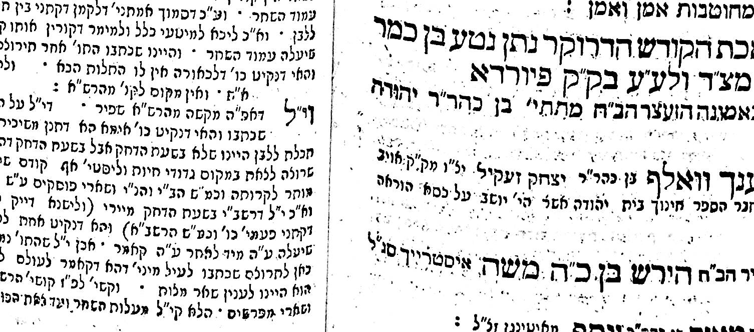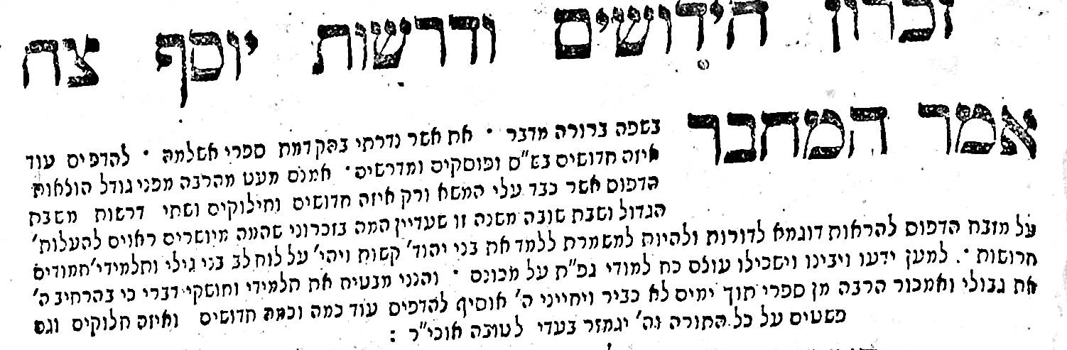 In the introduction, Rabbi Steinhardt decries the Chassidim, who were beginning to spread out during that period. Written in the month of Nissan 1773, the introduction references Zamir Aritzim V’Charavot Tzurim (“To prune and cut down all thorns … that surround the rose.”), the first and very controversial anti-Chassidic work published in 1772. Rabbi Steinhardt condemns those “who make most of their days festivals, who chirp and make noises during their prayers, emit various strange sounds, and change many customs.” In his vehement denunciation of Chassidus, he goes so far as to label it a cult. He writes, “There is no respite from them… they make most of their days holidays… their prayers are unbearable to the ears… they produce various noises… like a monkey to man… G-d save us from them.” He also mentions those who came to reside in Germany, referring to the brothers Rabbi Shmelke of Nikolsburg and Rabbi Pinchas Horowitz, the author of Sefer Haflaa, followers of the Maggid of Mezeritch, who were appointed rabbis in Germany.