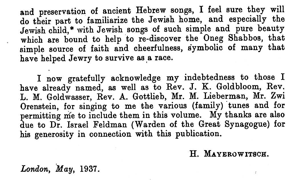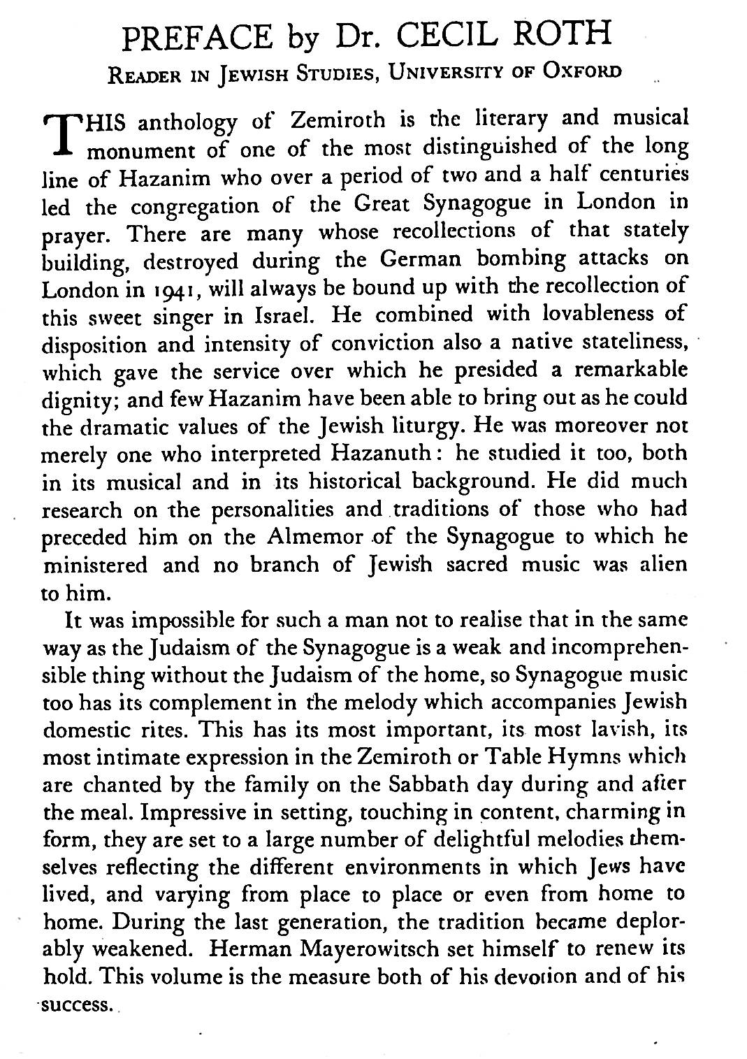 Herman Mayerowitsch was born on June 13th, 1882, in Deraznia, a small town in Russia where his father was buergermaster or mayor. At an early age he went with his parents to Czortcow (then Austrian Poland). He had a natural gift for singing, and at the age of 22 was appointed Chazan (Cantor) at Peczel, near Budapest. Later he went to Stuhlweisenburg, Hungary and in 1910 he was appointed Chazan in Misslitz, Czechoslovakia. He passed the State Examination in Music at the Vienna Conservatoire and from 1913 to 1921 he was Oberkantor of the Muellner Tempel and Lecturer in Liturgy and Music at the Seminary for Religious Teachers in Vienna.