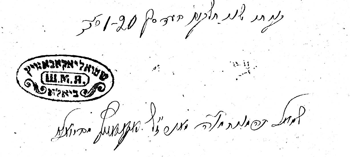 This volume was apparently purchased by Shmuel David Jakubowicz, possibly when he was living in Biala. He was born on May 27th, 1892, and by 1937 he was a bookkeeper, employed in the secretariat of the Lublin Jewish Community. He obviously took some pride in his ownership of books, and this one has four different book stamps of his. One of the stamps gives his address as 16, Szeroka, Lublin.