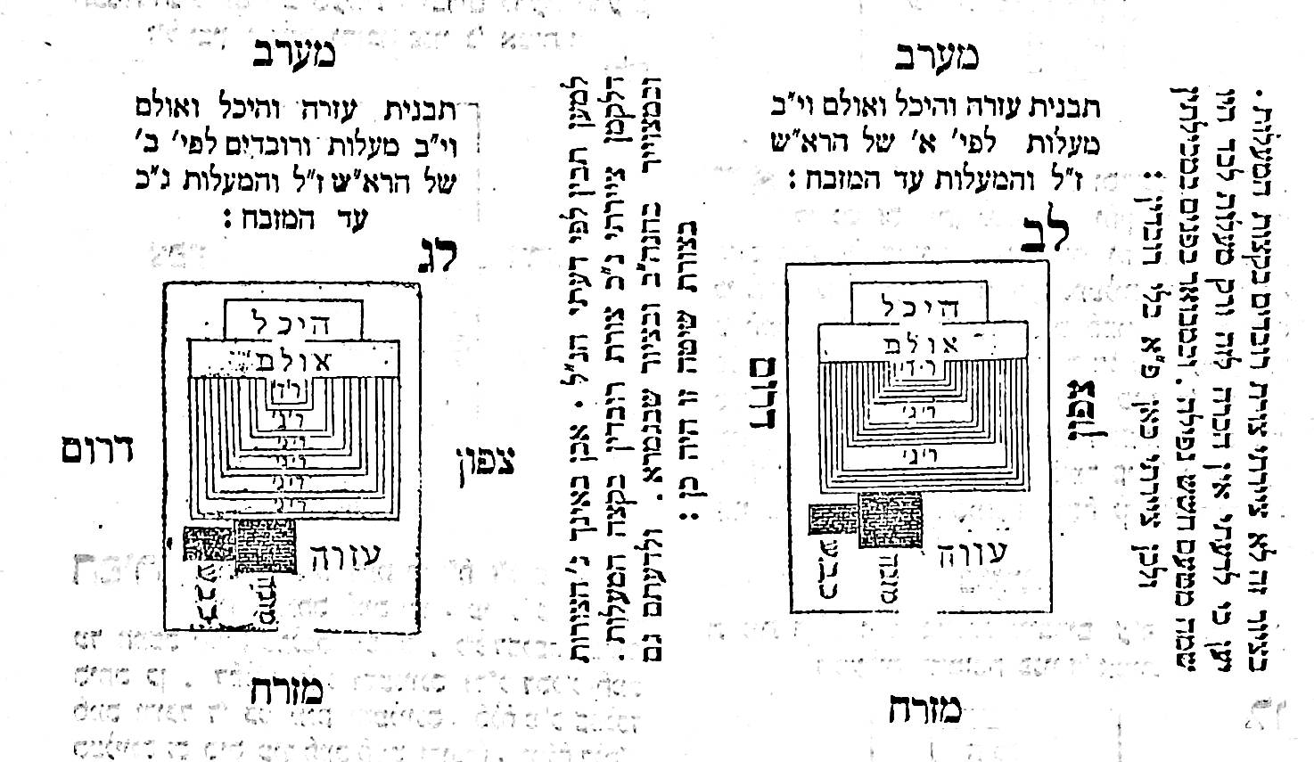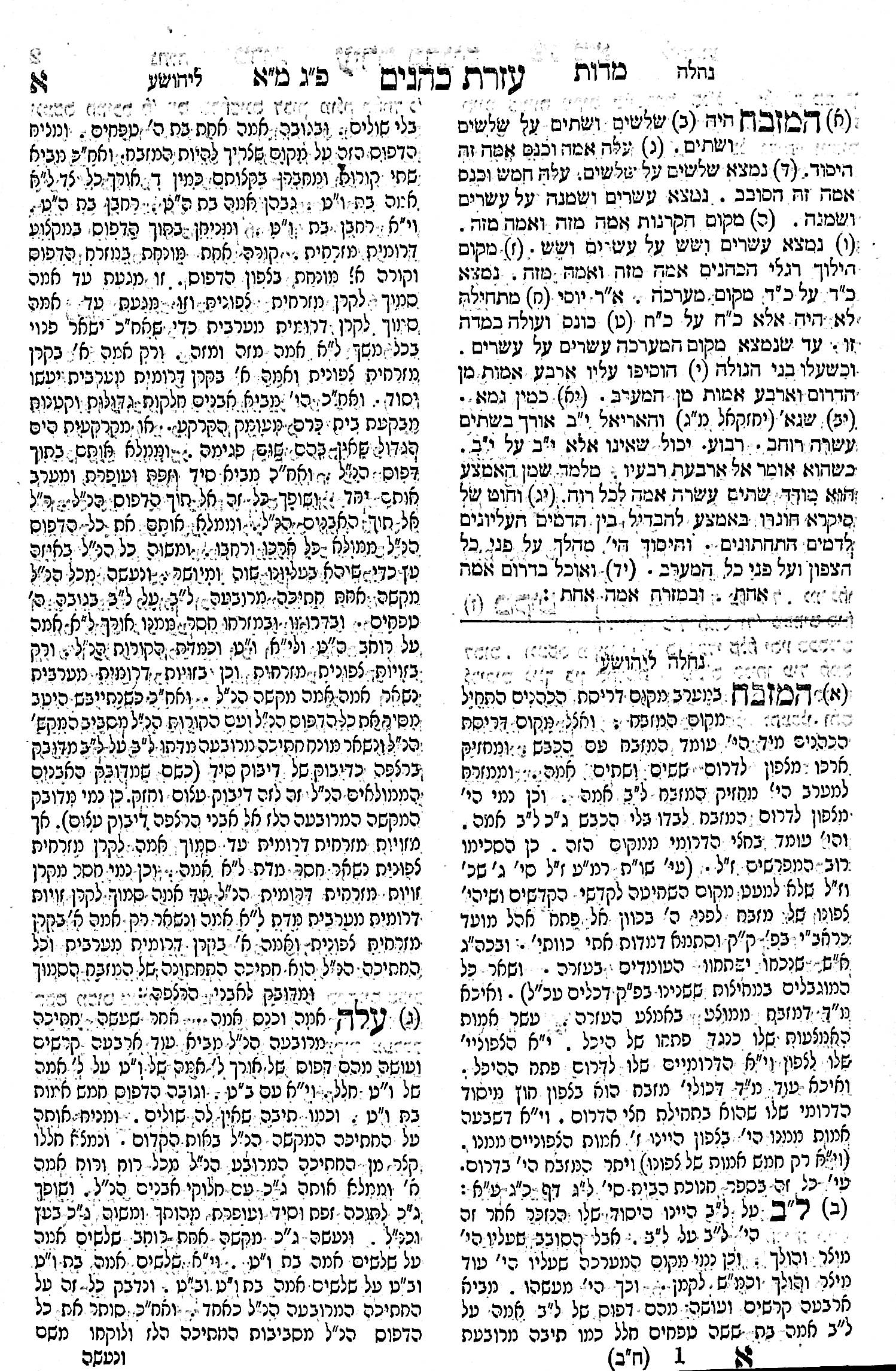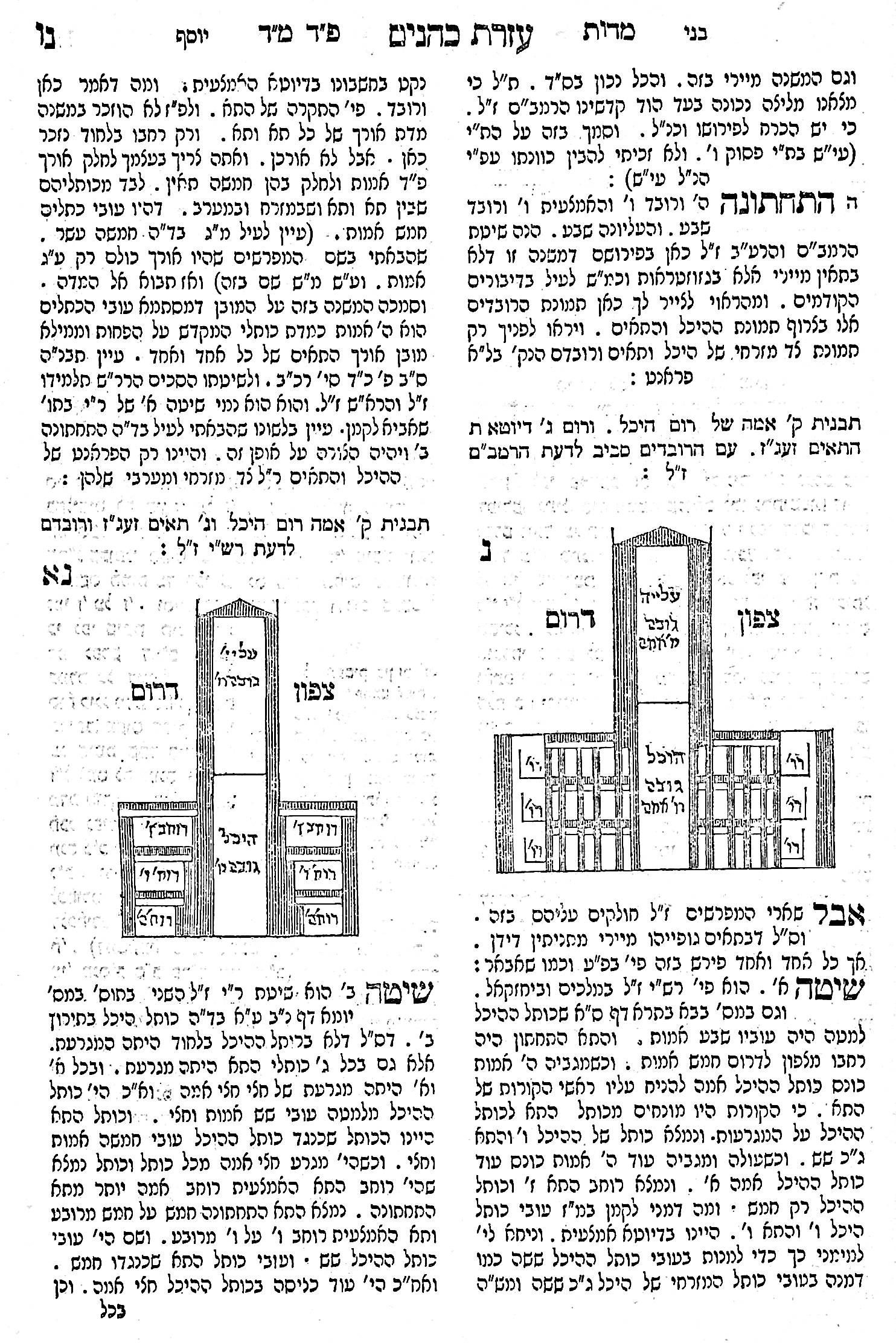 Ezras Kohanim is an important and detailed commentary on the tractate Middos by Rabbi Yehoshua Yosef ben Nachum Dov haKohen Feinberg. It was compiled from from the works of the early sages and of early and later commentaries. It describes the Temple according to all the commentators, and gives appropriate measurements. There are many illustrations and diagrams.