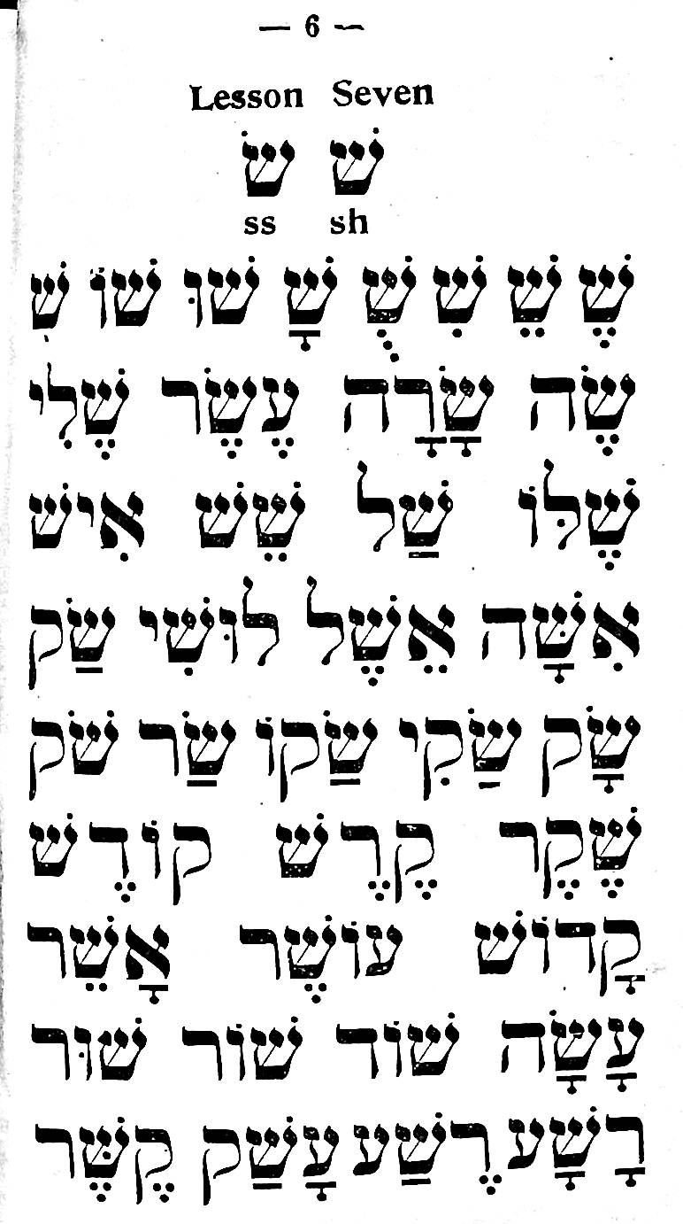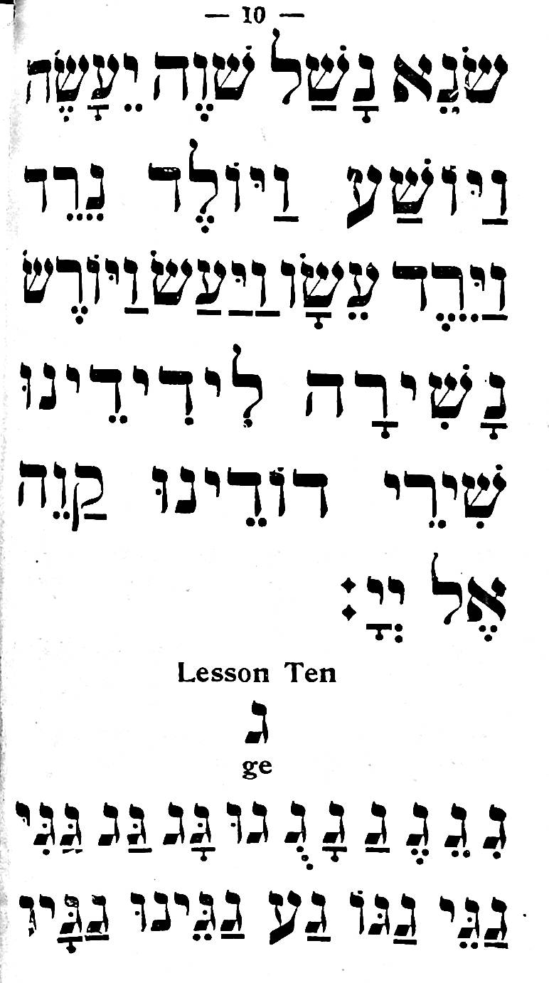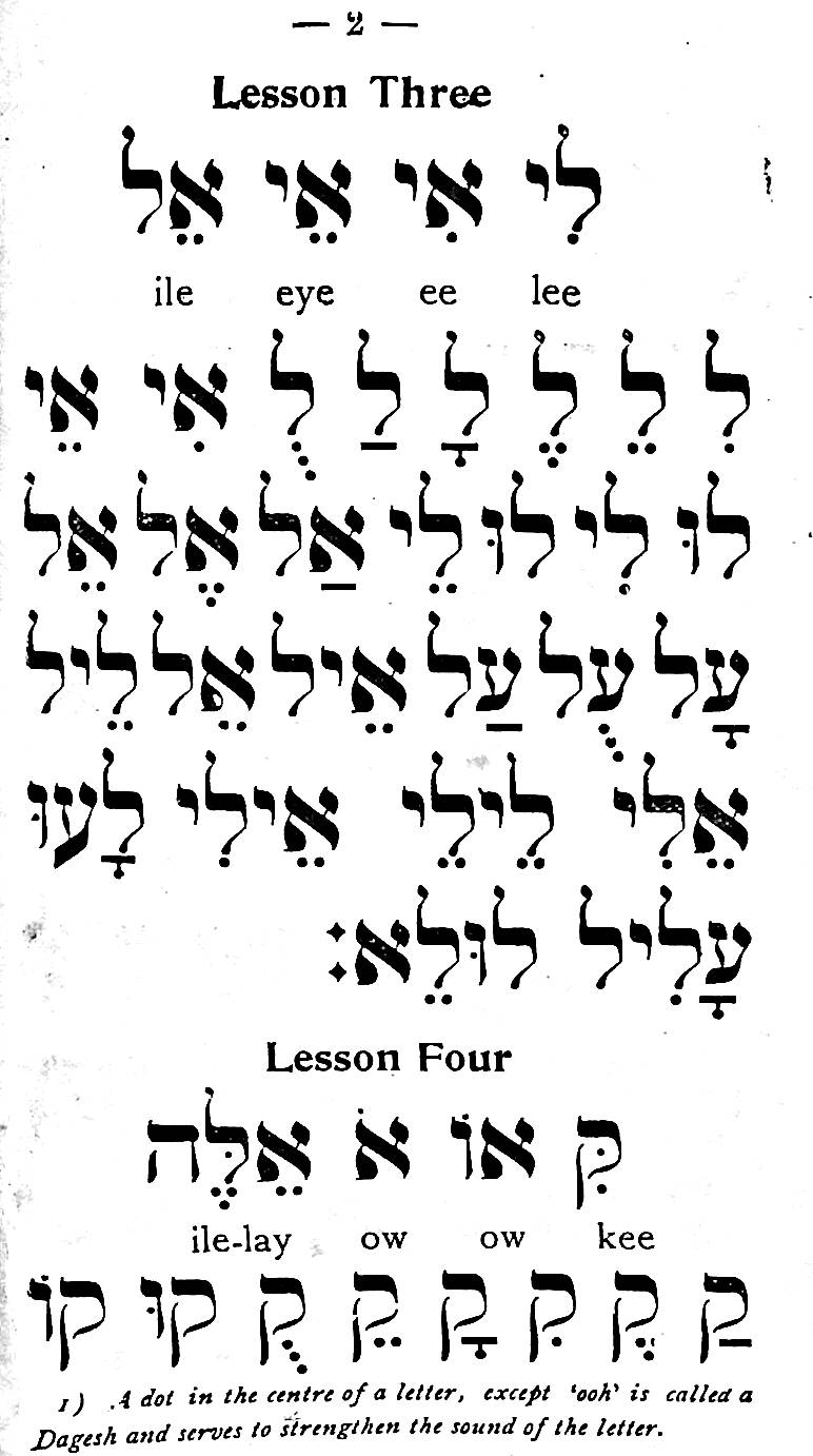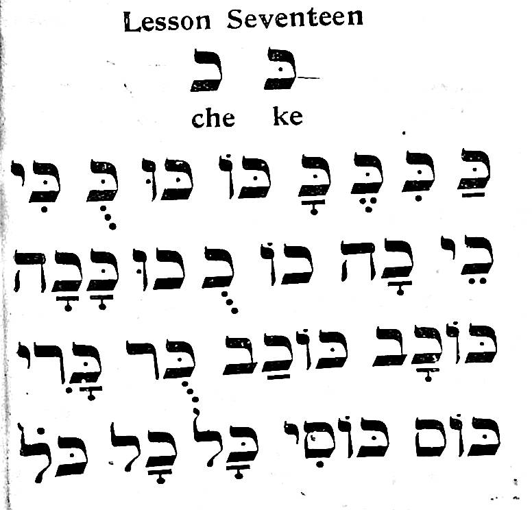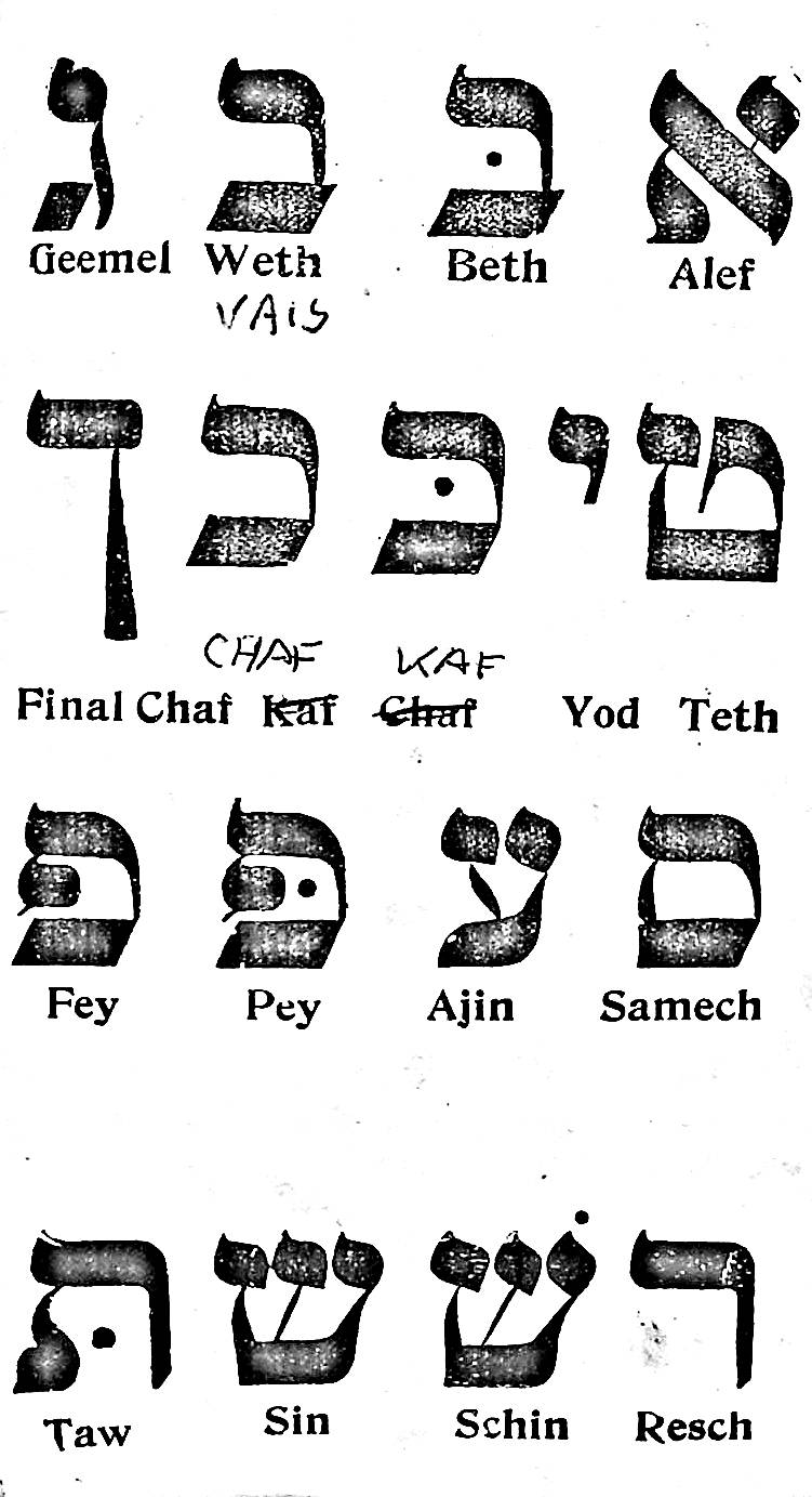 I wonder what the children made of the rather Germanized names of the letters: Alef, Beth, Weth, Geemel, Daleth, Hey, Waw, Sajin, Cheth, etc.