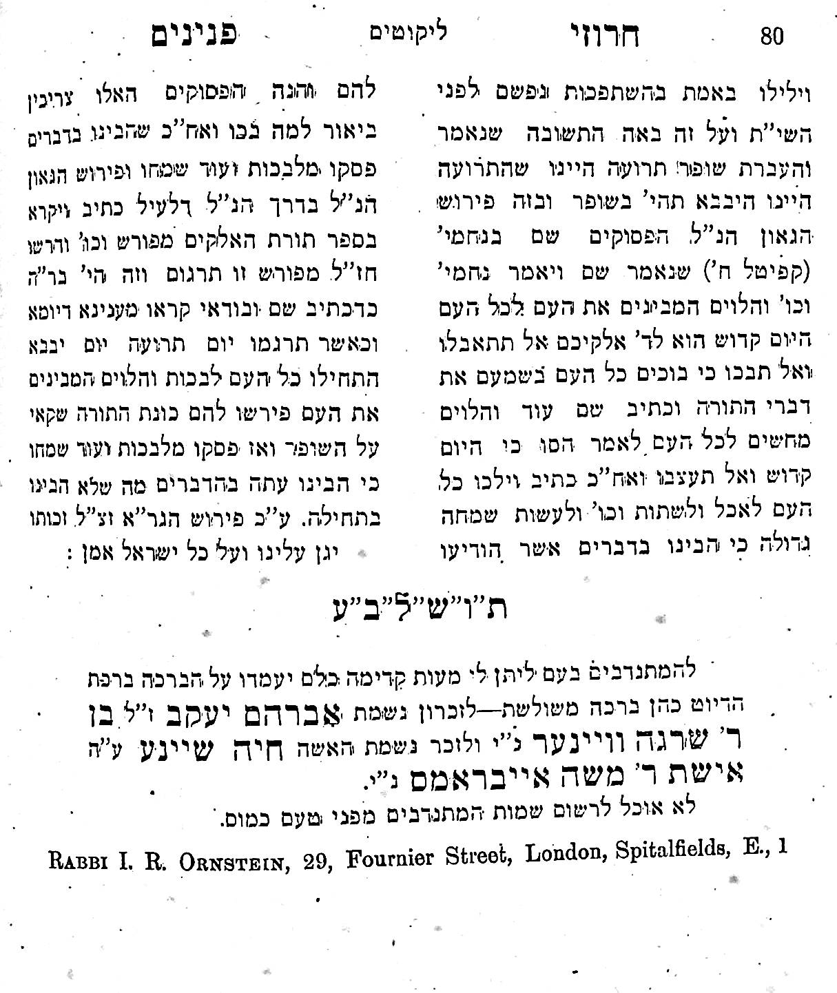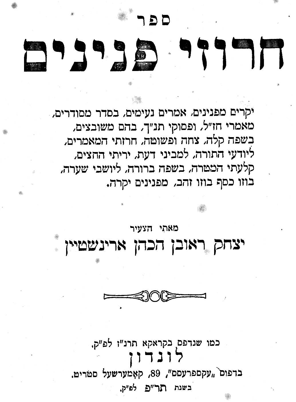 This book, Charuzei Peninim, was originally published in Krakau in 1897. It was reprinted in London in 1919/1920 by Express Printers of 89 Commercial Street, complete with two important haskomos (approbations) from the first edition.