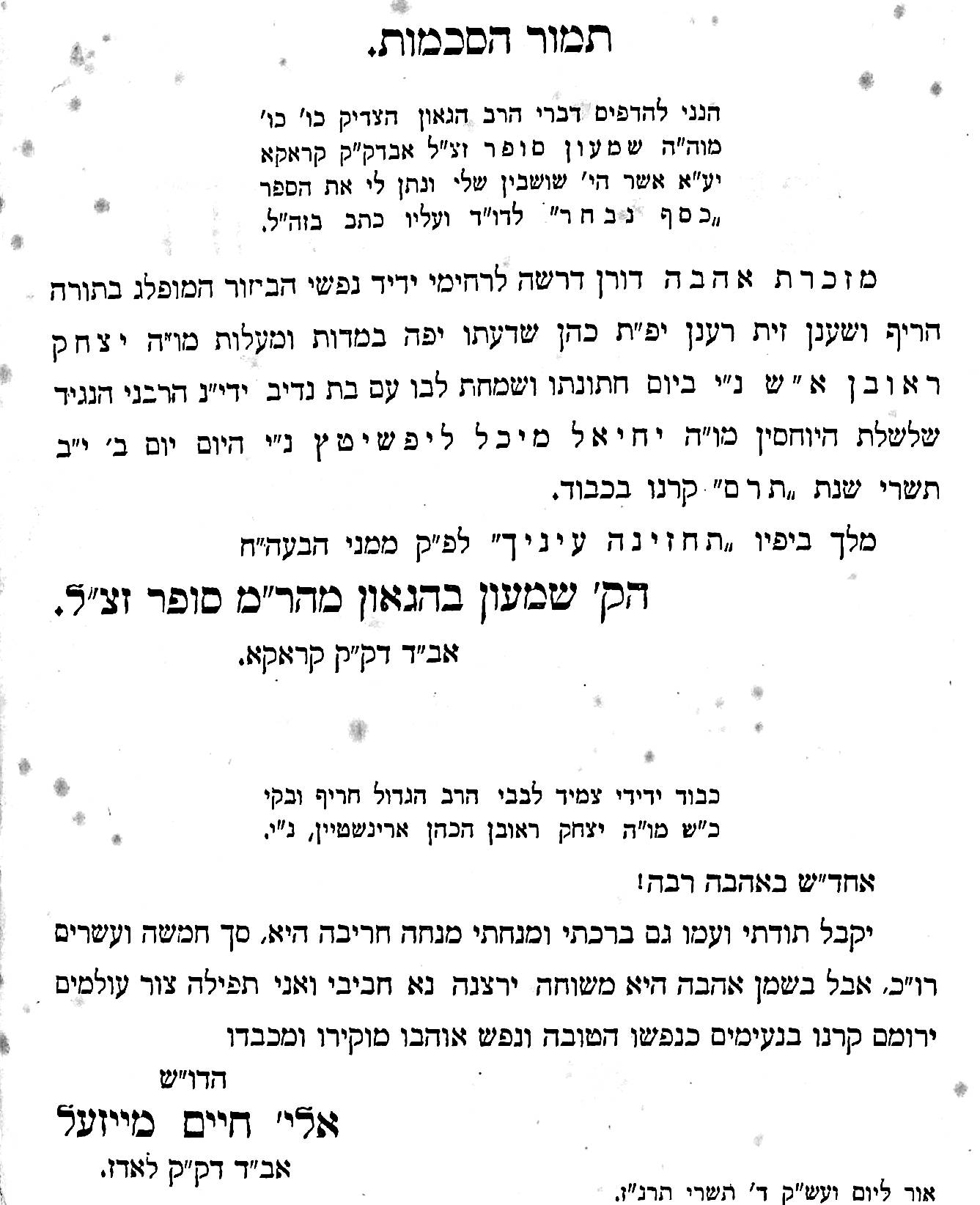 The first is from Rabbi Shimon Sofer (1820- 1883). He was the second son of the Chasam Sofer, and was Chief Rabbi of Krakow from 1859.