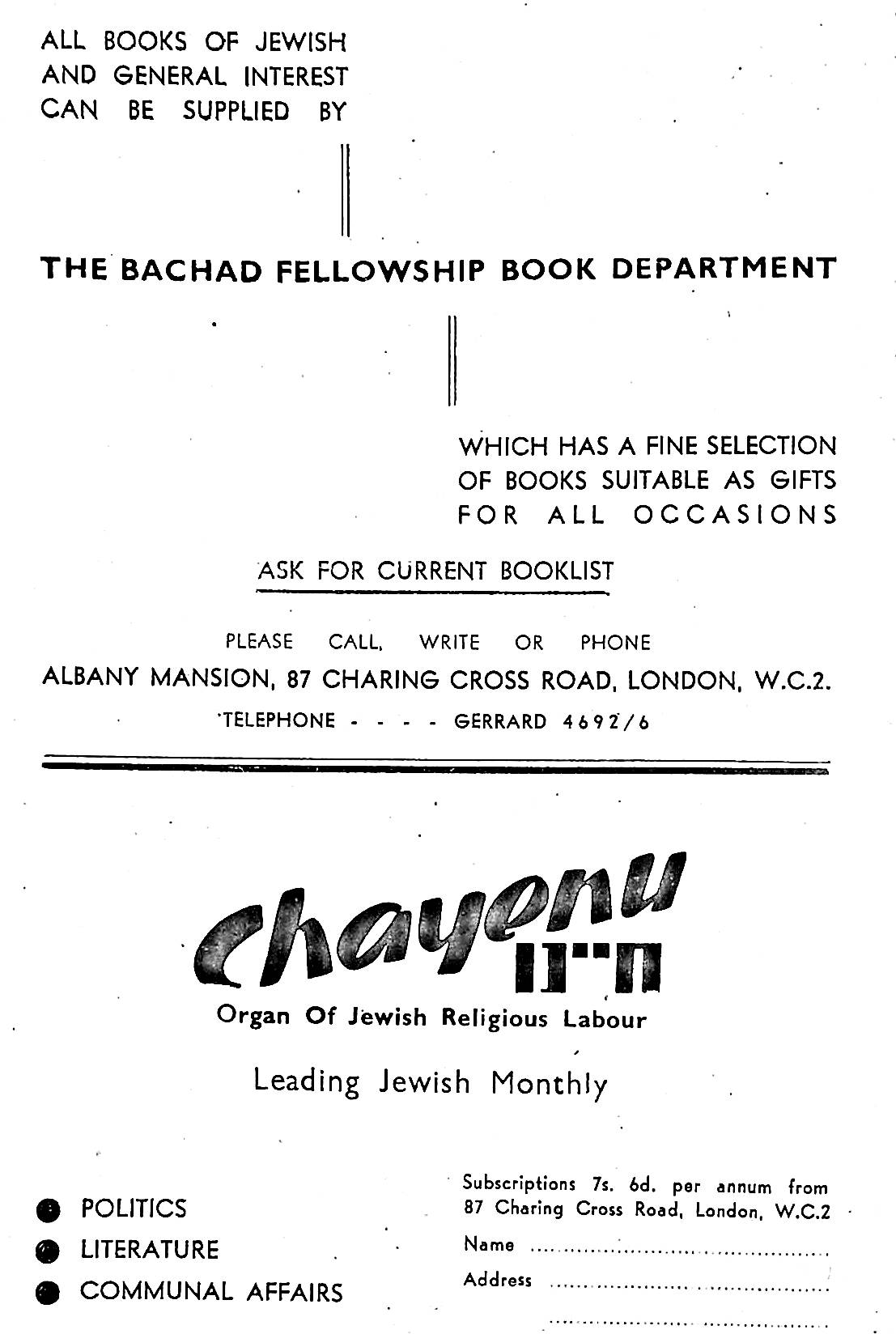 This book was published by the “Bachad Fellowship” in England. Bachad, which are the initial letters of Brit Chalutzim Datiim, the orthodox Jewish pioneering movement, was started in Germany in 1928. It’s purpose was to equip young orthodox religious Jews with agricultural or other skills which they could use, eventually to settle in British mandated Palestine. This was to be done without any compromise on their religious beliefs and practices.