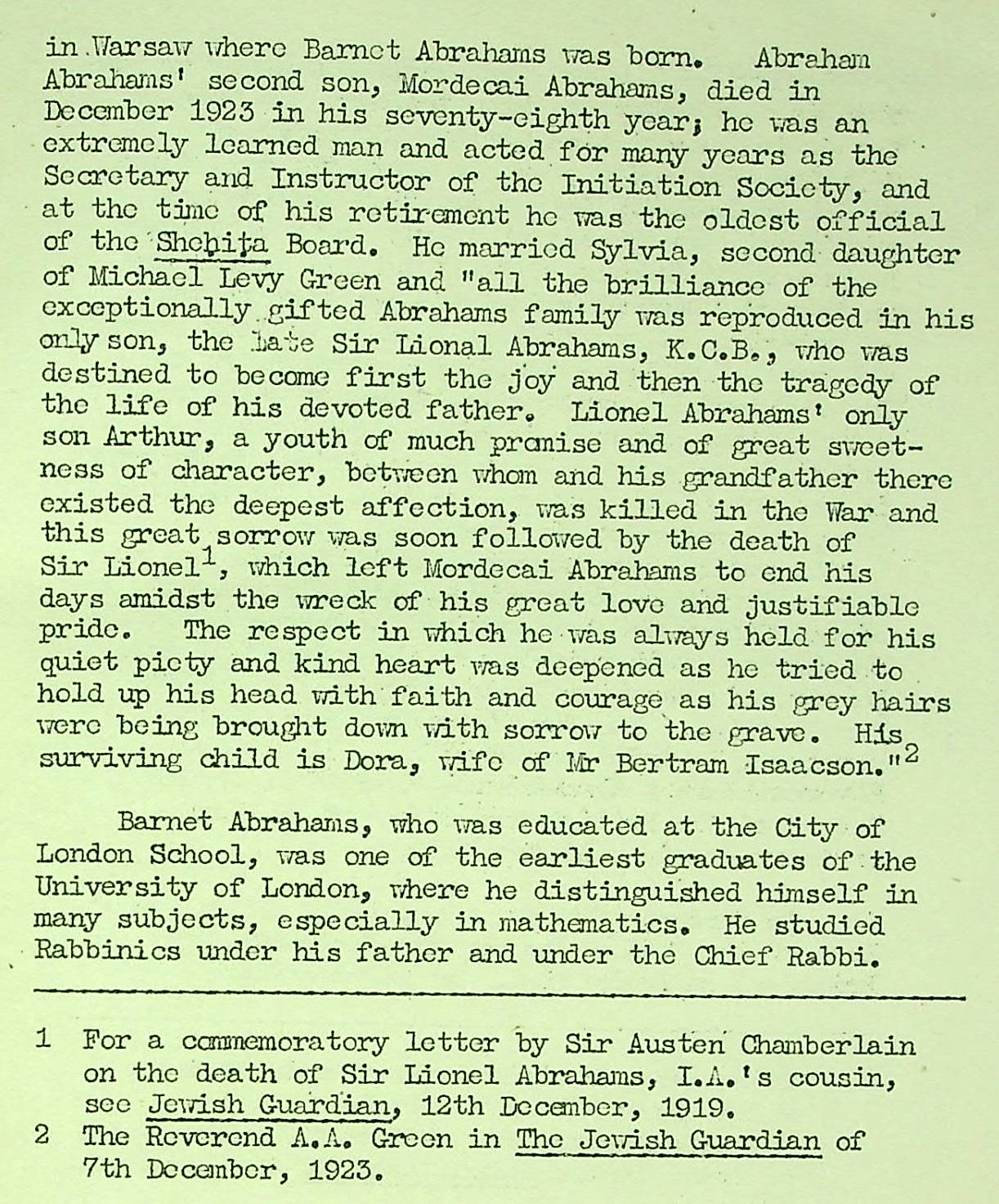 Rabbi Abraham Sussman’s son, Dayan Barnet Abrahams, was Israel Abraham’s father. He was originally known as Baruch Leib Sussman and was a student of the Medrash at Bevis Marks, as well as University College, London. In 1854 he was appointed Assistant Dayan at Bevis Marks, and in 1856, Dayan. Sadly, he died at a young age, in 1863.