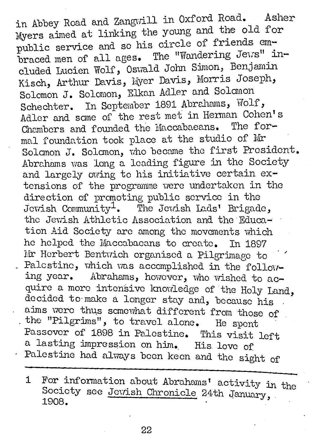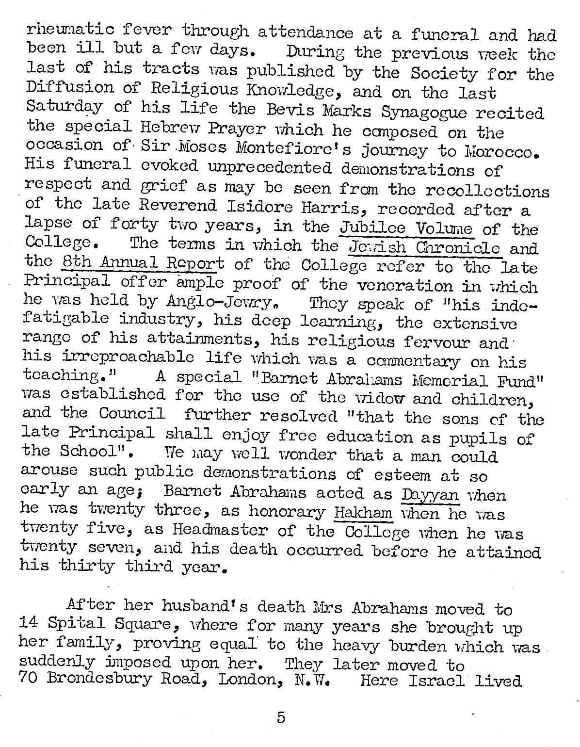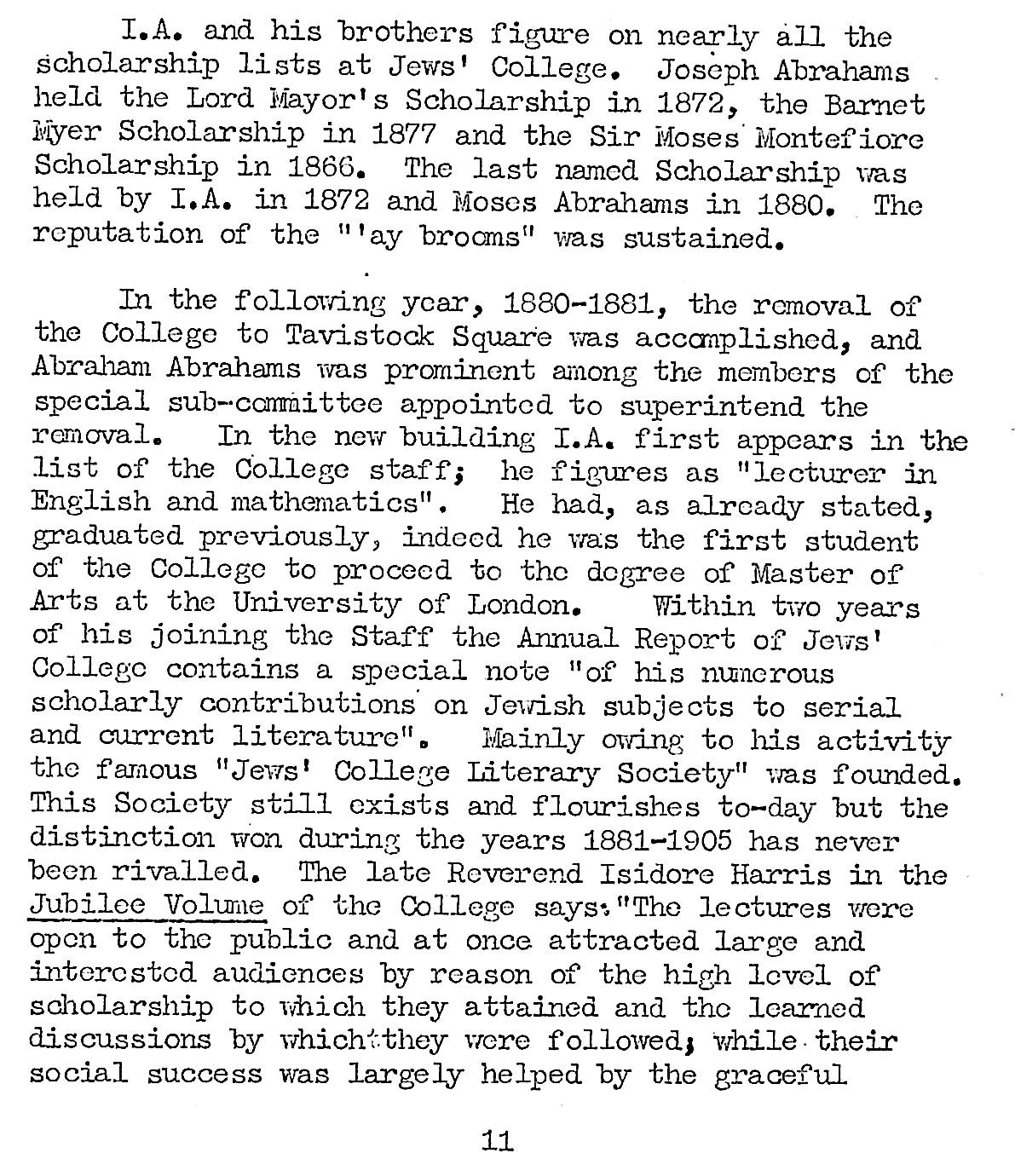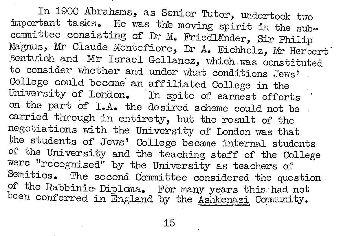 Israel Abrahams was only five when his father died. For the first 44 years or so of his life he was associated with Jews College (now renamed the London School of Jewish Studies), where he was educated, and subsequently became Senior Tutor. In 1902 he became Reader in Rabbinic and Talmudic Literature at Cambridge. He was a writer, an academic, a journalist and joint editor of the Jewish Review when it was published in London. He was a member of an intellectual group called “The Wandering Jews”, which originally centred around the old St John’s Wood Synagogue in Abbey Road.