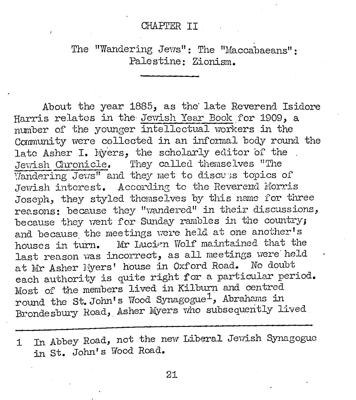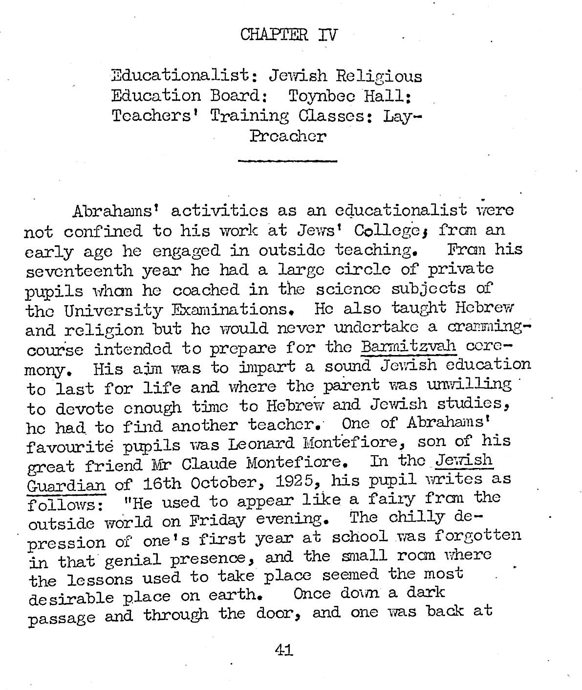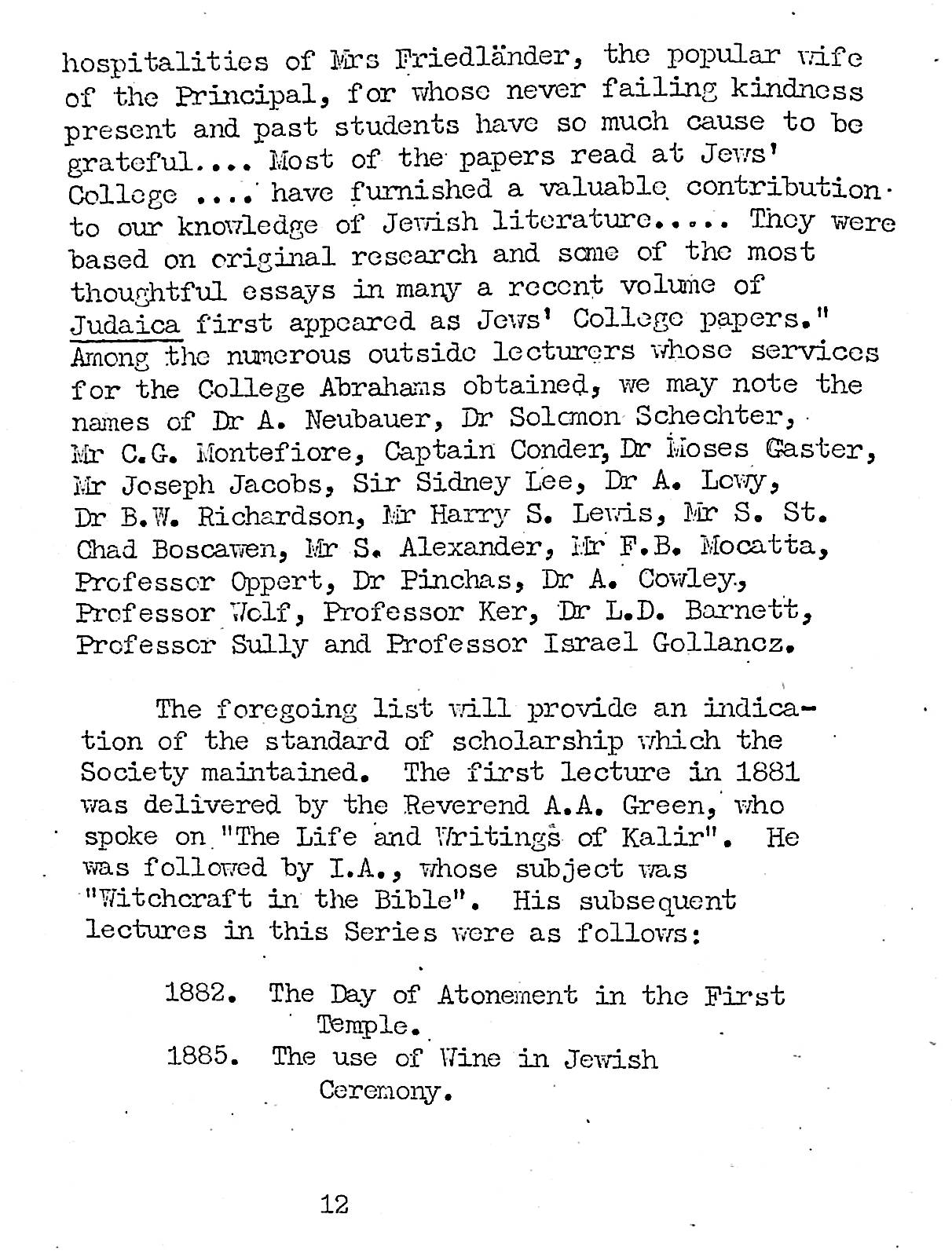 Israel Abrahams was only five when his father died. For the first 44 years or so of his life he was associated with Jews College (now renamed the London School of Jewish Studies), where he was educated, and subsequently became Senior Tutor. In 1902 he became Reader in Rabbinic and Talmudic Literature at Cambridge. He was a writer, an academic, a journalist and joint editor of the Jewish Review when it was published in London. He was a member of an intellectual group called “The Wandering Jews”, which originally centred around the old St John’s Wood Synagogue in Abbey Road.