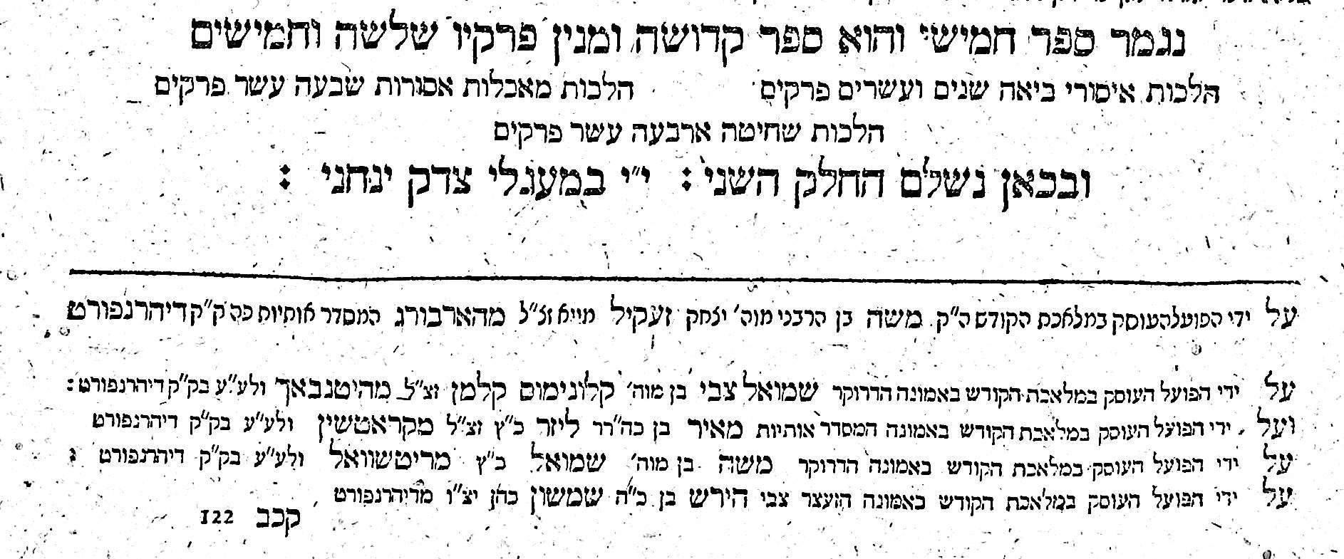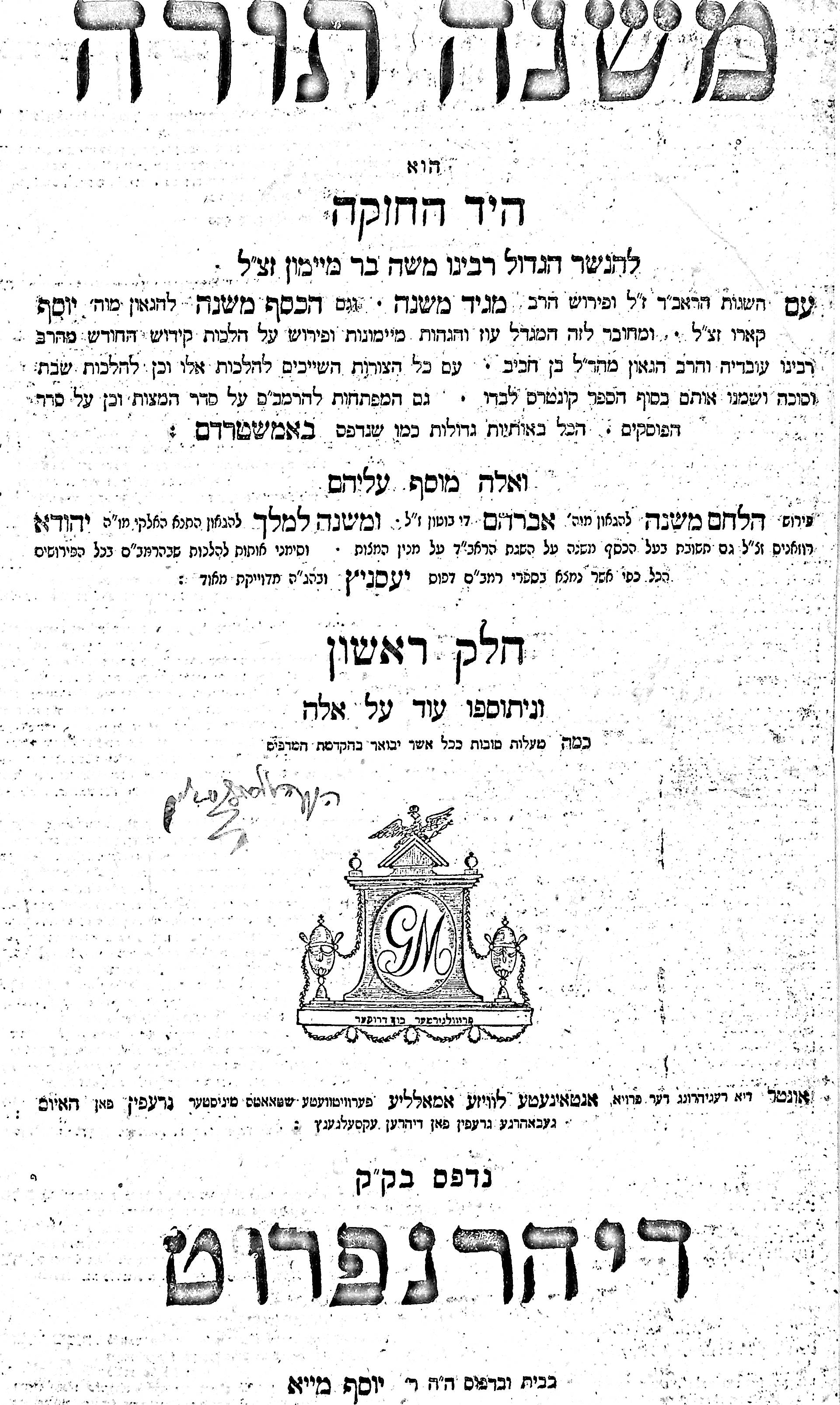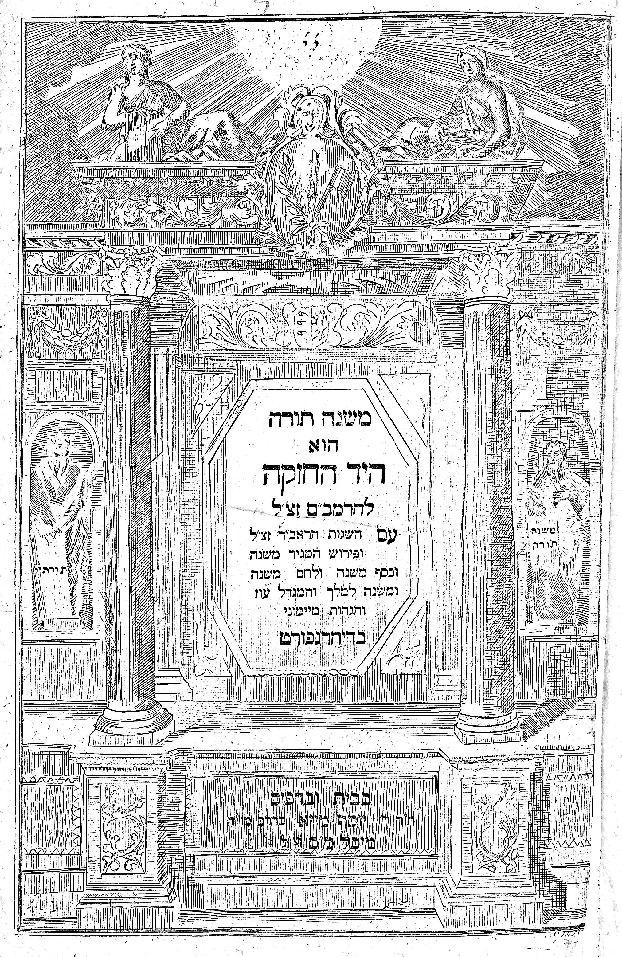 Two editions of the Talmud were printed in Dyhernfurth, the first from 1800 to 1804 and the second from 1816 to 1824. This edition of the Mishneh Torah was printed between the two. This Dyhernfurth press was operated by the May family. Jehiel Michael May, the founder of this family press, died on 14 Tevet, 5555 (January 5, 1795) in Breslau. After his death, the press first was run by his widow Rachel and afterward by his sons Michael Simon, Aron, and Joseph, and later by Joseph alone.