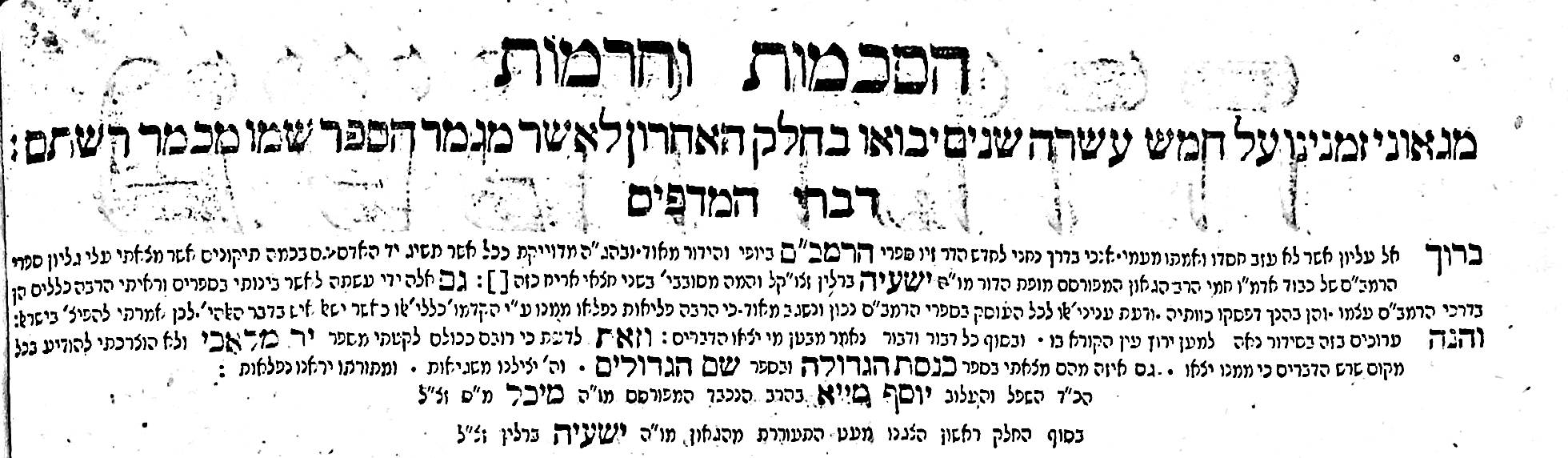 Dyhrenfurth (in Polish Brzeg Dolny) is a town in lower Silesia, whose Jewish community was established with the first Hebrew printing house there in 1688 and declined with the closure of the printing houses there in the late nineteenth century. It was known for fine and popular editions.
