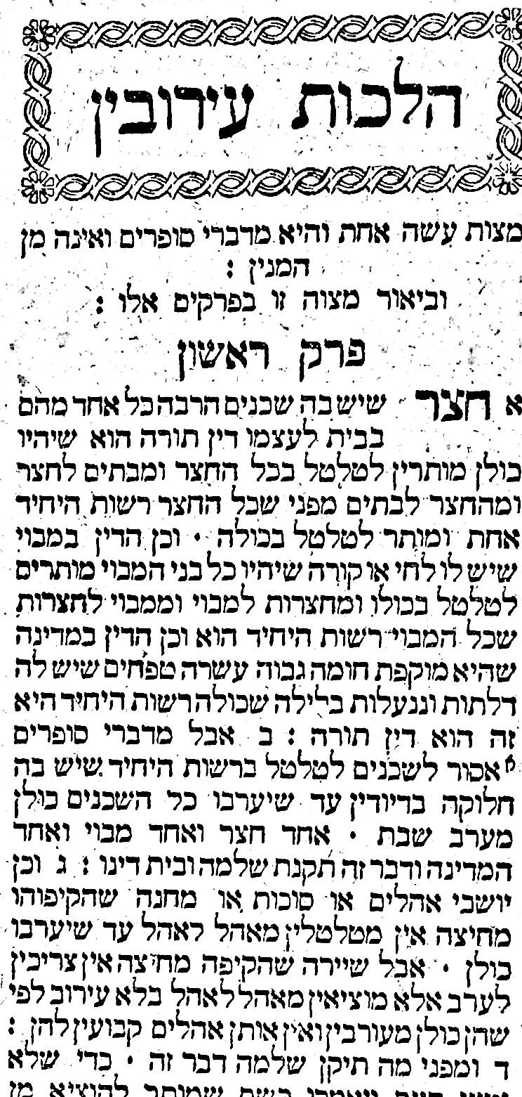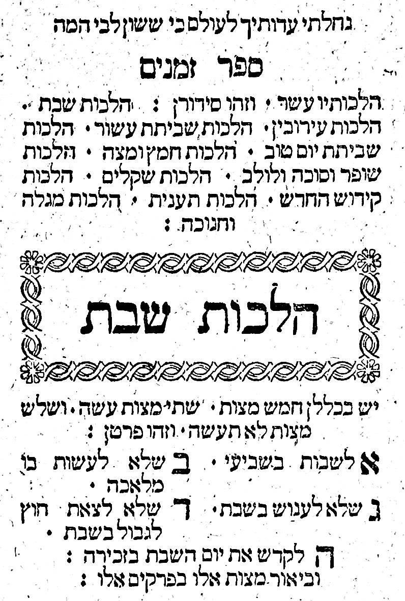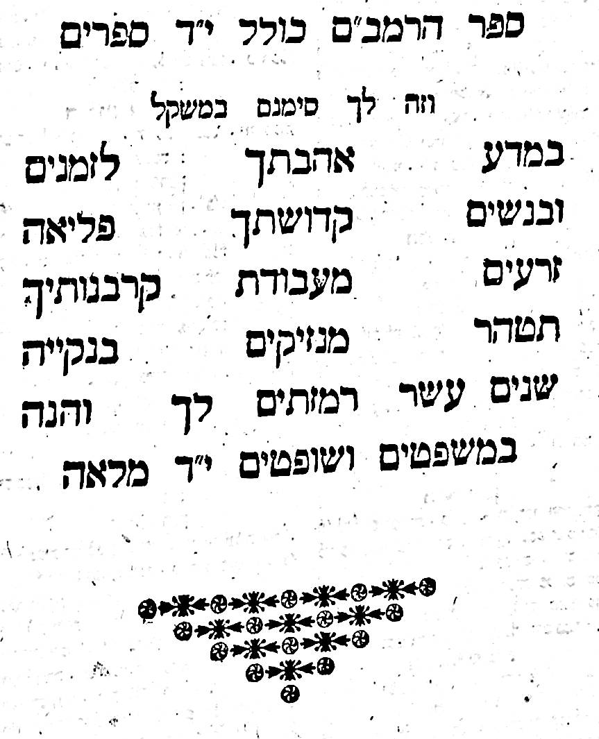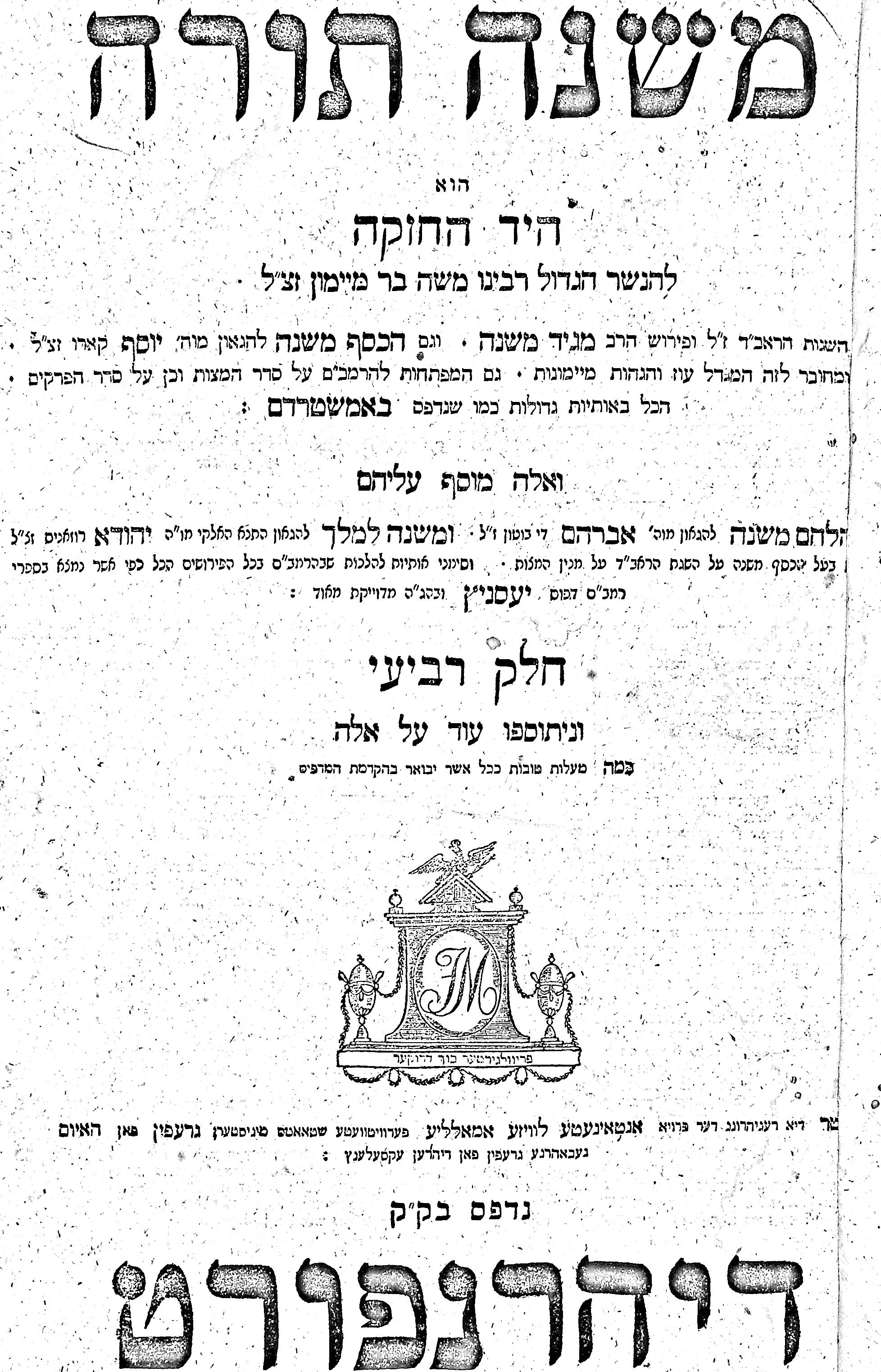 His great work was the Mishneh Torah (repetition of the Torah), also called Sefer Yad Hachazakah (the book of the Strong Hand), consisting of fourteen books which provide a complete code of Jewish law. My copy – in four hefty volumes – was printed in Dyhrenfurth from 1809 at the Press of Yosef Mai.