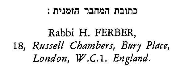 Rabbi Ferber was a prolific author and was renowned as a riveting orator who gave his sermons in Yiddish. He was active in communal affairs, and established the Chesed V’emeth Burial Society in 1915. He was for many years the honorary secretary of the London “Vaad Harabonim” (rabbinical council of the Federation of Synagogues) and chairman of the Association of London Rabbis (“Hisachdus Harabonim”). he was a member of the World Rabbinical council of Agudas Yisroel. He closely collaborated with Rabbi Dr Meir Jung and Rabbi Dr Victor Schonfeld in communal issues. He was a friend of Rabbi Kook, Chief Rabbi of Palestine, from the time that the latter was Rabbi of Machzike Hadath in London. Rabbi Ferber died in November 1966.