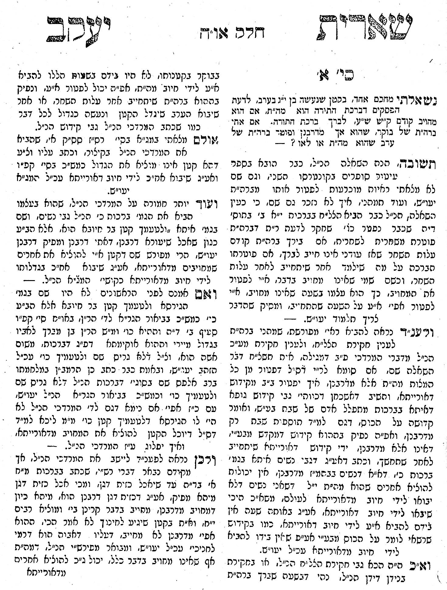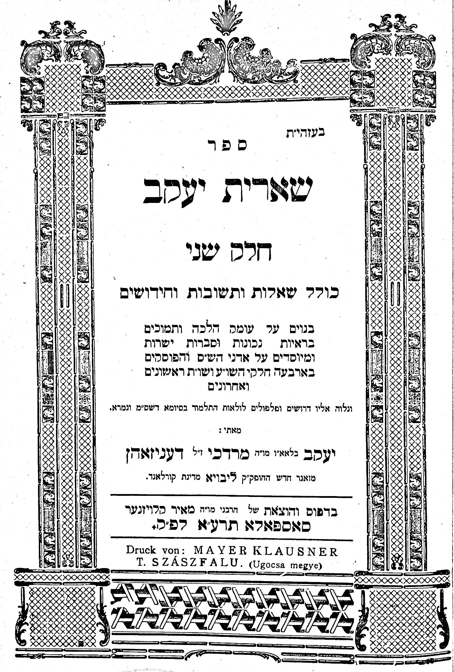 Rabbi Yaakov Denezohn (or Denisohn), published this book of Shaylos and Tshuvos (questions and answers), Sheeris Yaakov (The Offspring of Jacob), originally in 1896. This second edition was published in 1911 in Saszfalu.