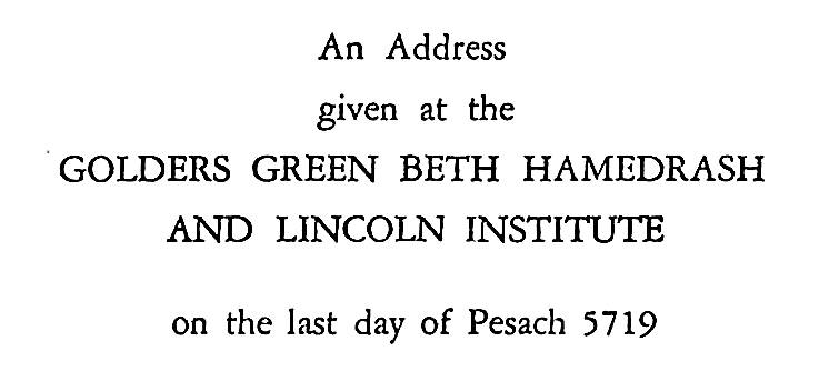 This short talk was given by Rabbi Dr. Eliahu Munk of Golders Green, London (not to be confused with his cousin Rabbi Elie Munk of Paris) at the Golders Green Beth Hamedrash in London, on the last day of Pesach 5719 (1959).